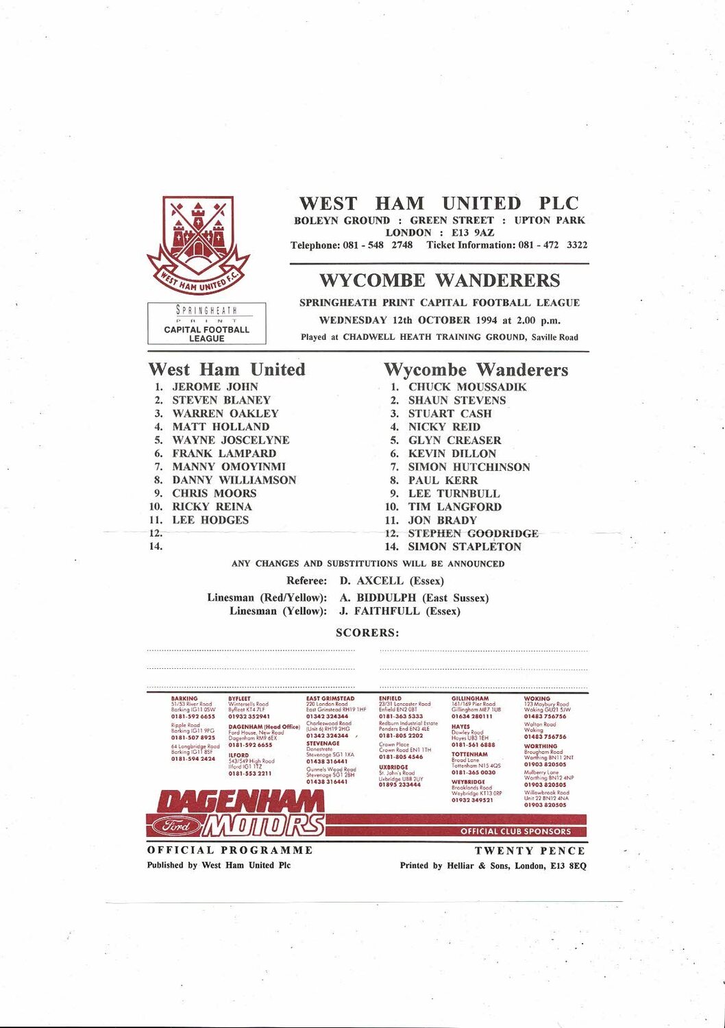 West Ham United v Wycombe Wanderers Capital League Football Programme 1994/95