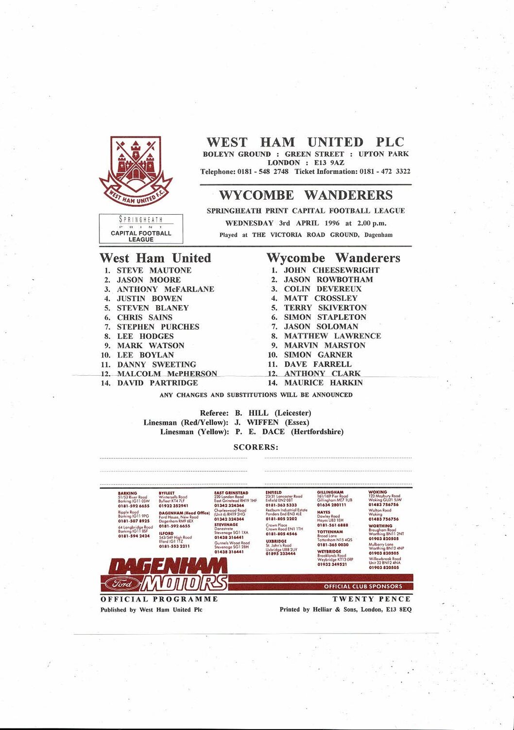 West Ham United v Wycombe Wanderers Capital League Football Programme 1995/96
