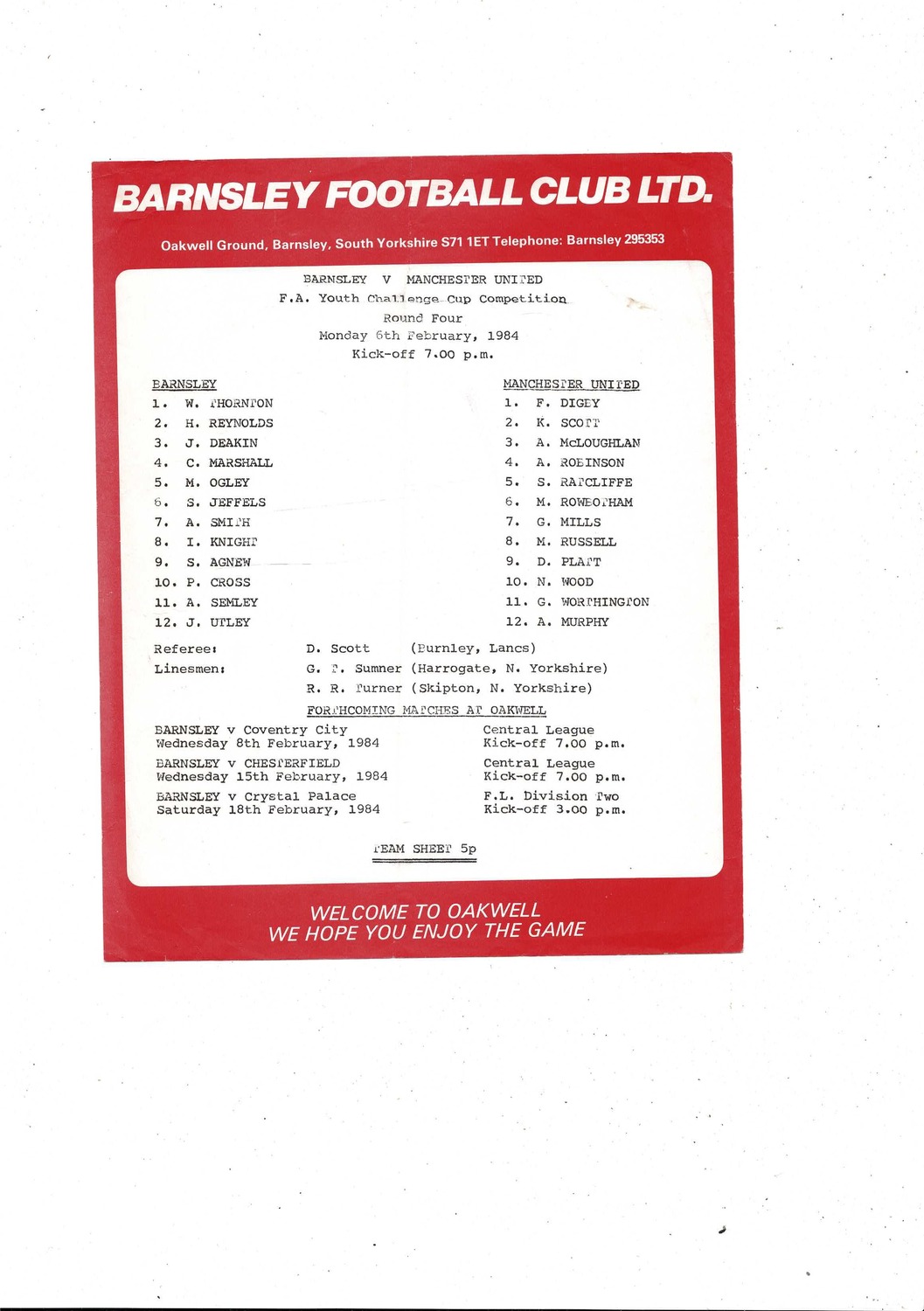 Barnsley v Manchester United FA Youth Cup Football Programme 1983/84