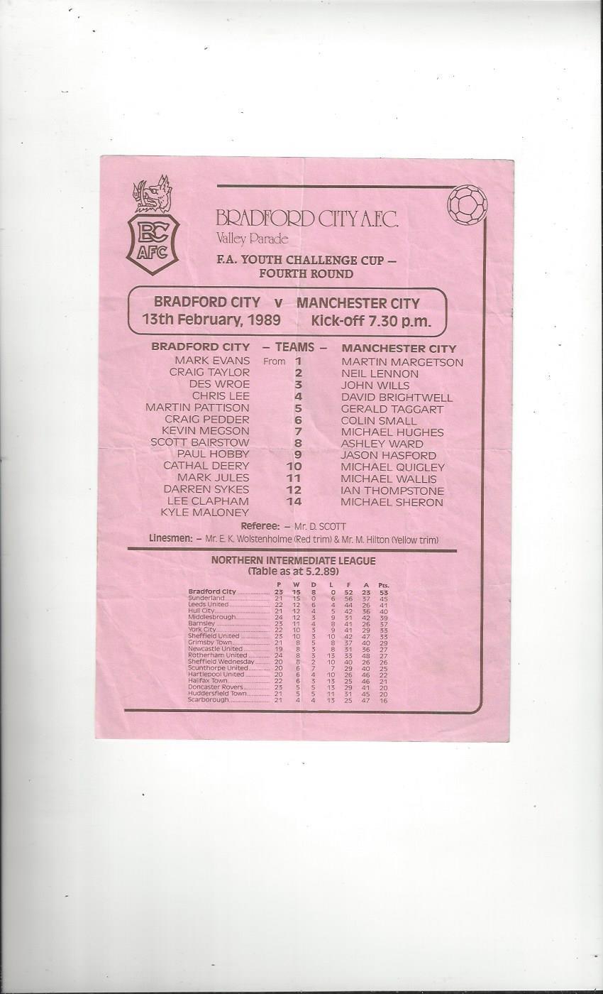 Bradford City v Manchester City FA Youth Cup Football Programme 1988/89