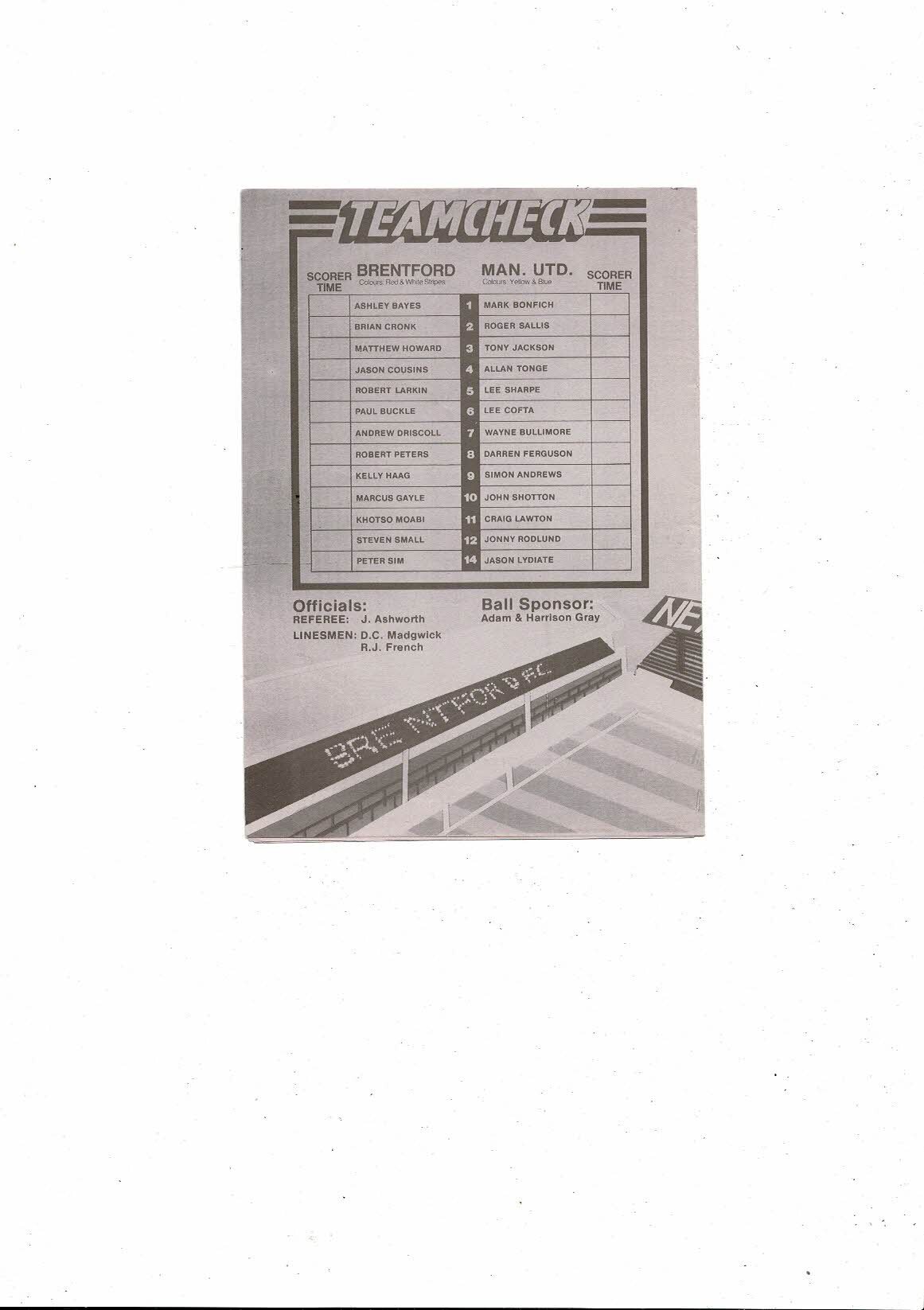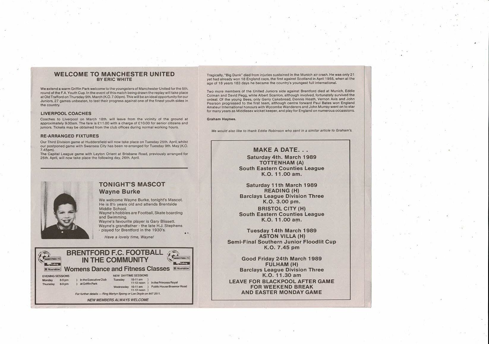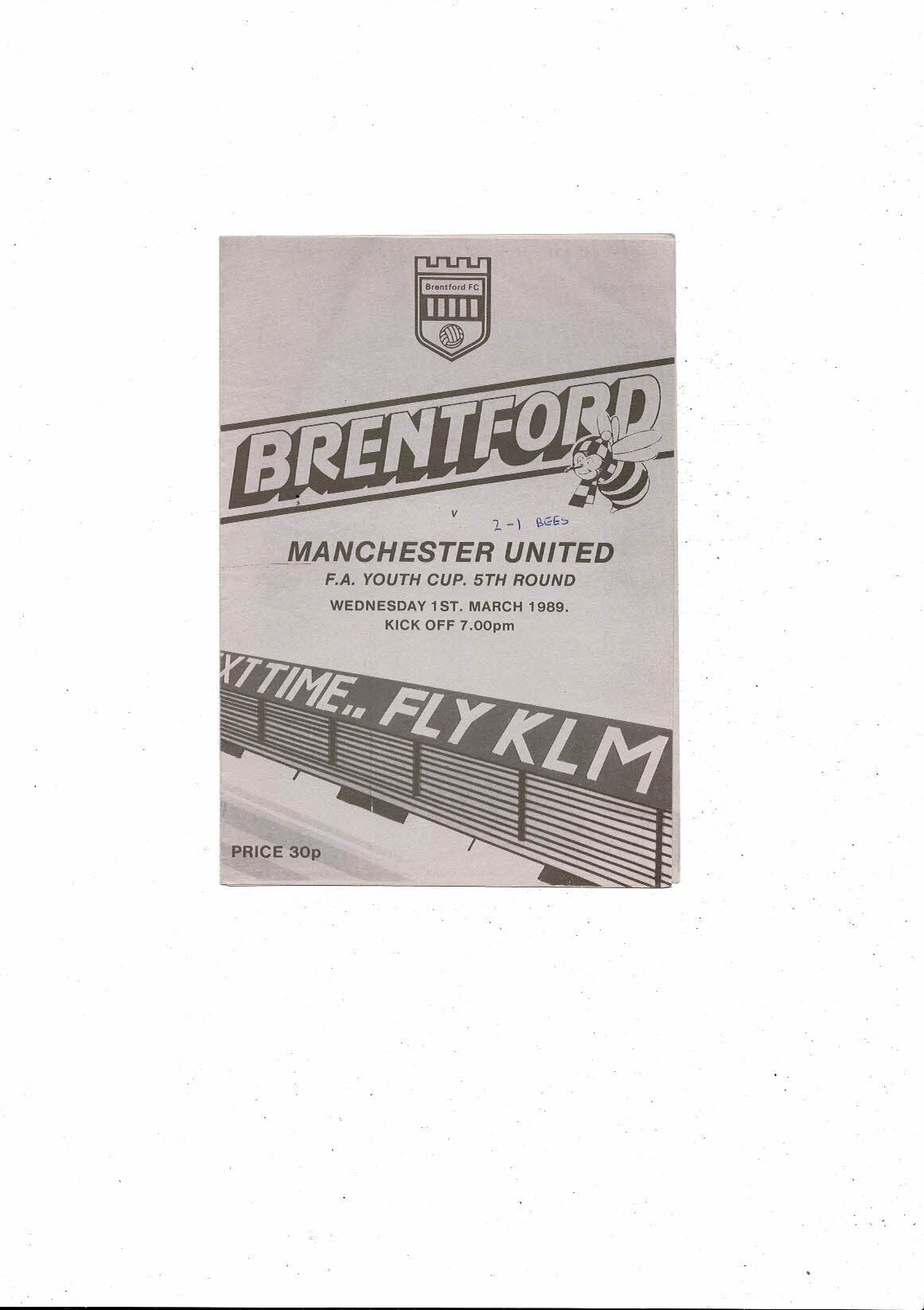 Brentford v Manchester United FA Youth Cup Football Programme 1988/89