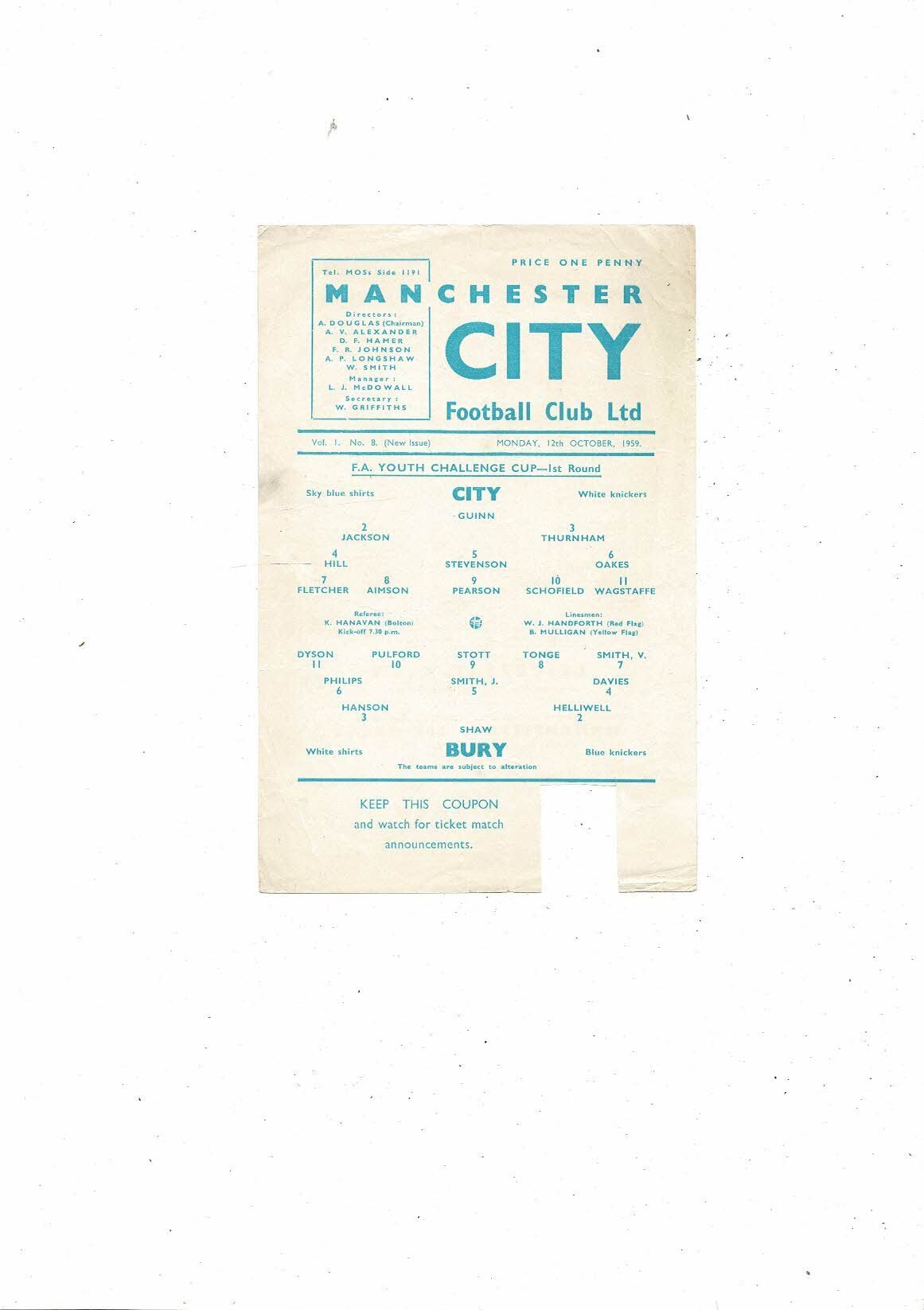 Manchester City v Bury FA Youth Cup Football Programme 1959/60