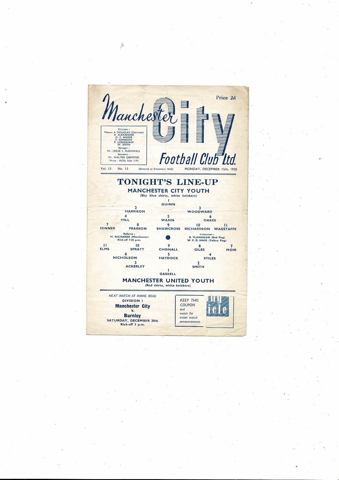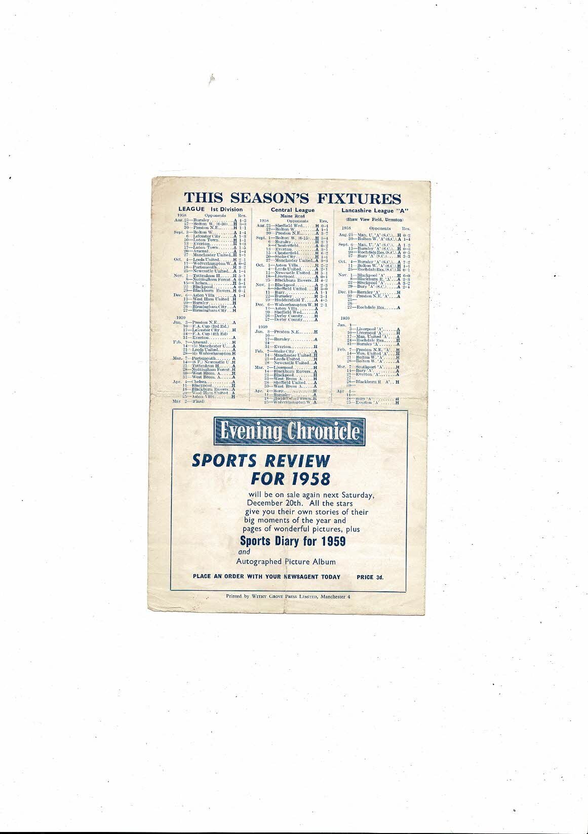 This Original 4 page Football Programme is creased & folded with some minor stainng, token removed, several tiny nic's & small tear on back page. No handwriting. Please see scans.