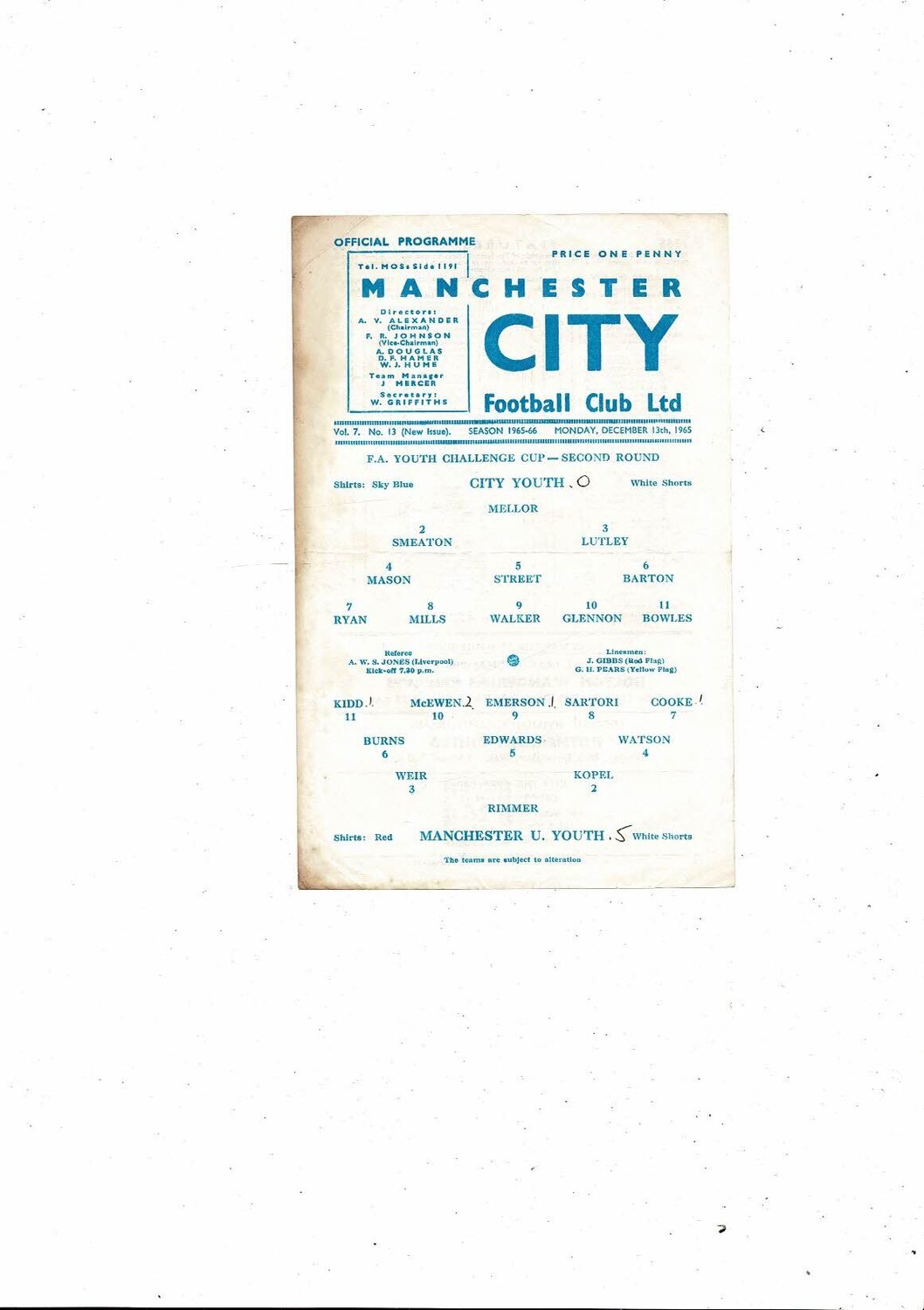 Manchester City v Manchester United FA Youth Cup Football Programme 1965/66