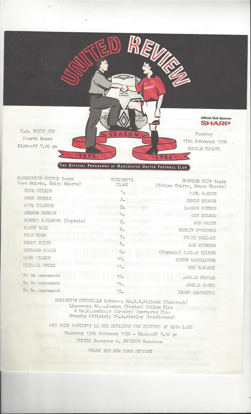 Manchester United v Norwich City FA Youth Cup Football Programme 1995/96