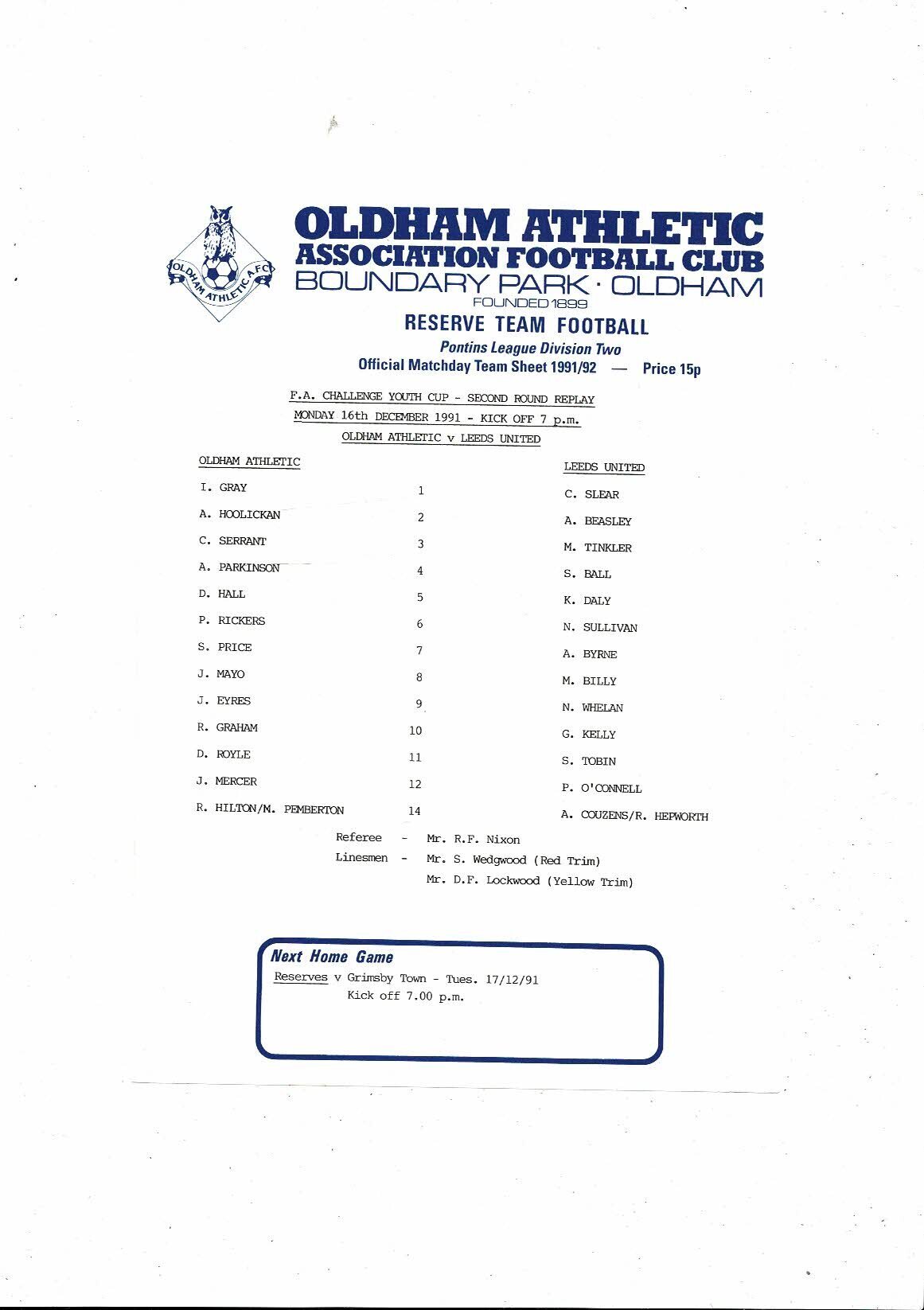 Oldham v Leeds United FA Youth Cup Replay Programme 1991/92 Dec 16th