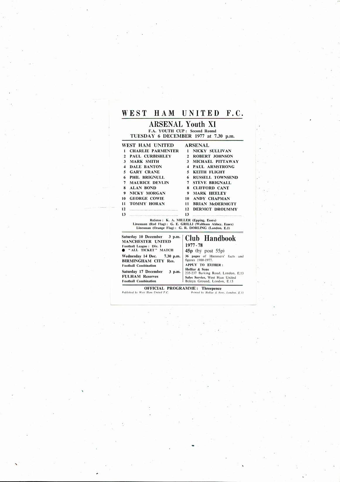 West Ham United v Arsenal FA Youth Cup Football Programme 1977/78