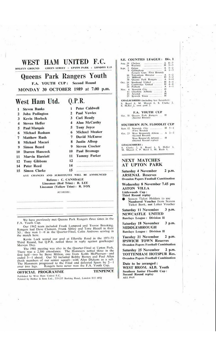 West Ham United v Queens Park Rangers Youth Cup Football Programme 1989/90