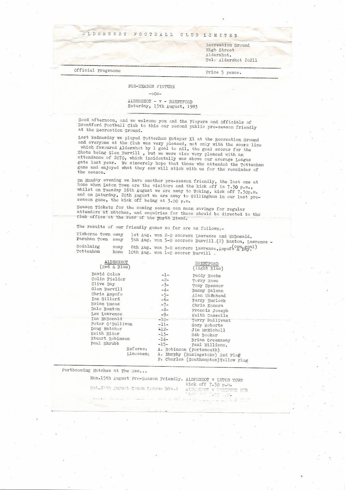 Aldershot v Brentford Friendly Football Programme 1983/84