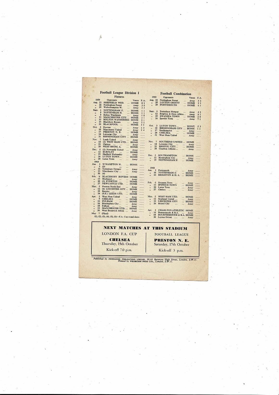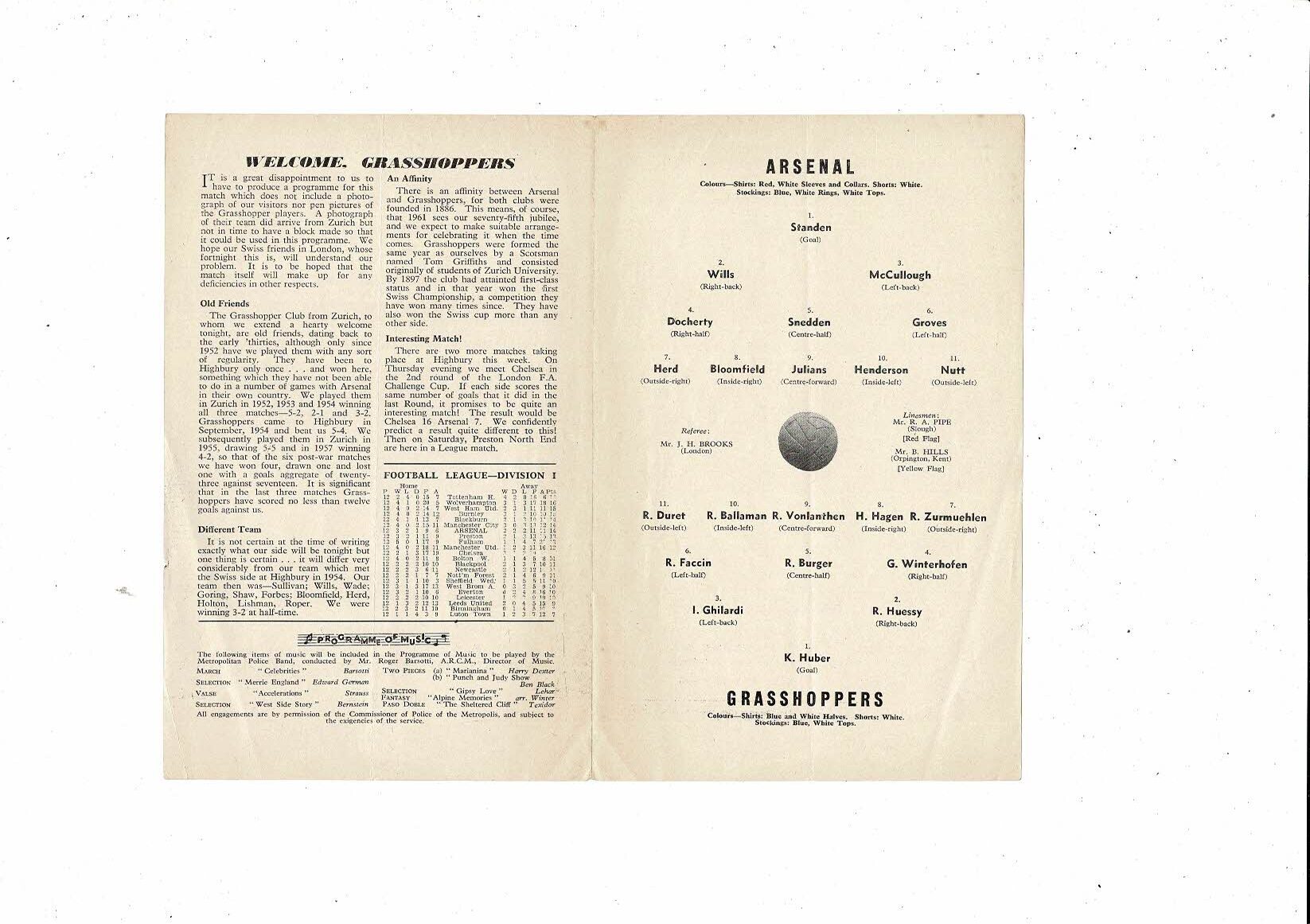 Arsenal v Grasshoppers Friendly Football Programme 1959/60