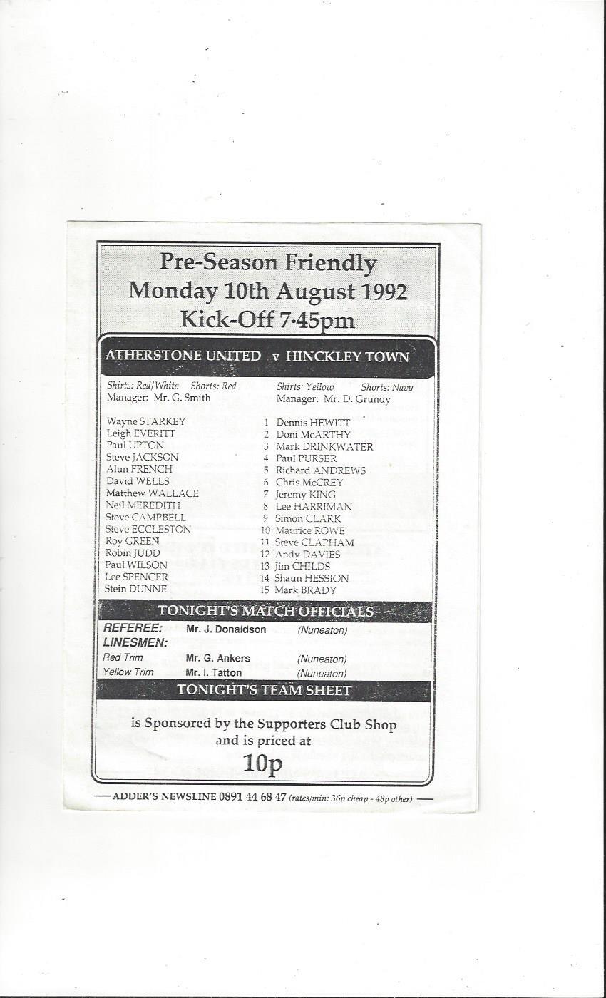 Atherstone United v Hinckley Town Friendly Football Programme 1992/93