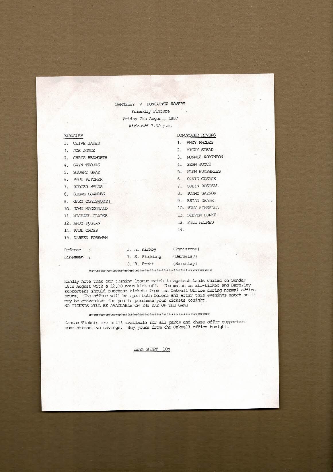 Barnsley v Doncaster Rovers Friendly Football Programme 1987/88