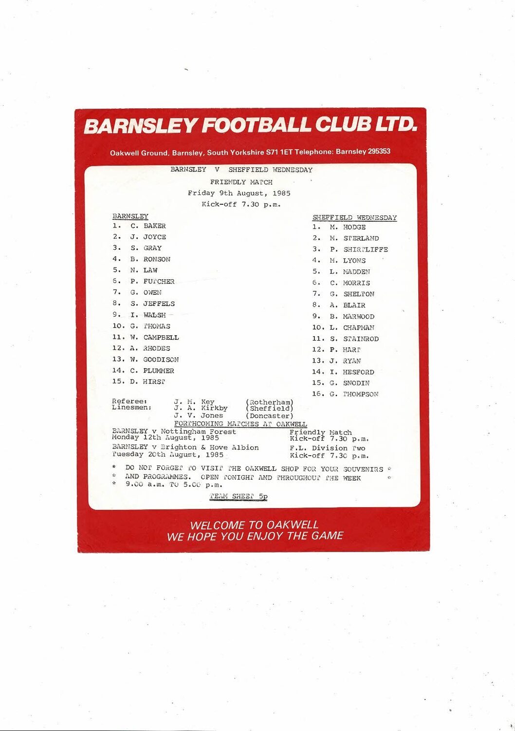 Barnsley v Sheffield Wednesday Friendly Football Programme 1985/86