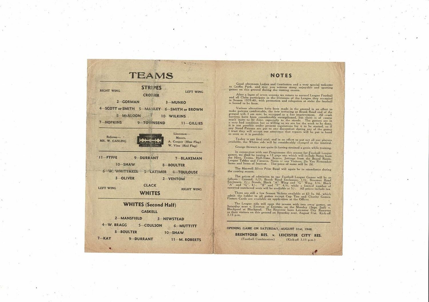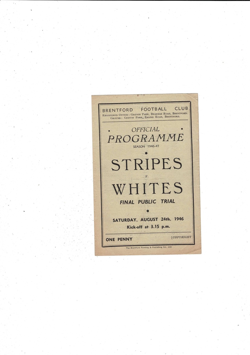 Brentford Strips v Whites Final Public Trial Football Programme 1946/47