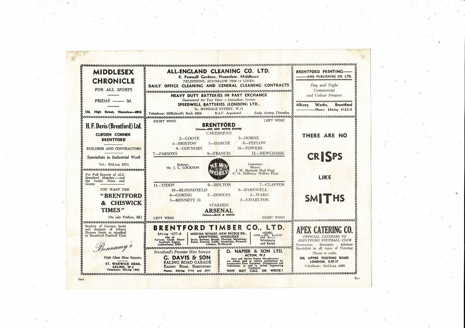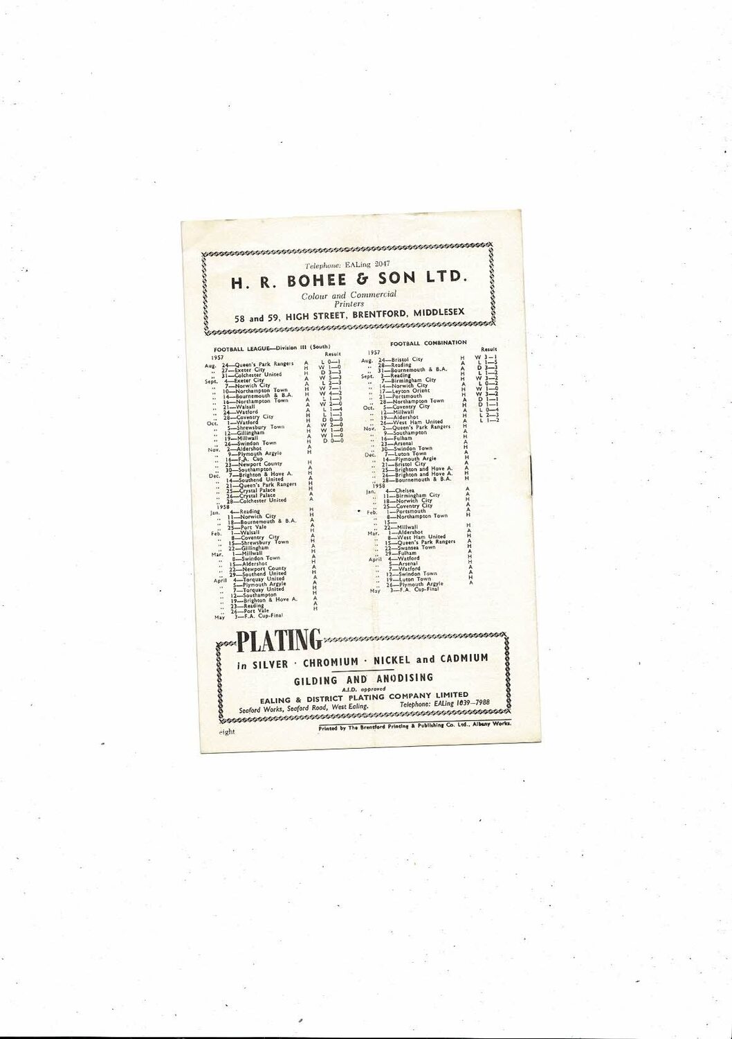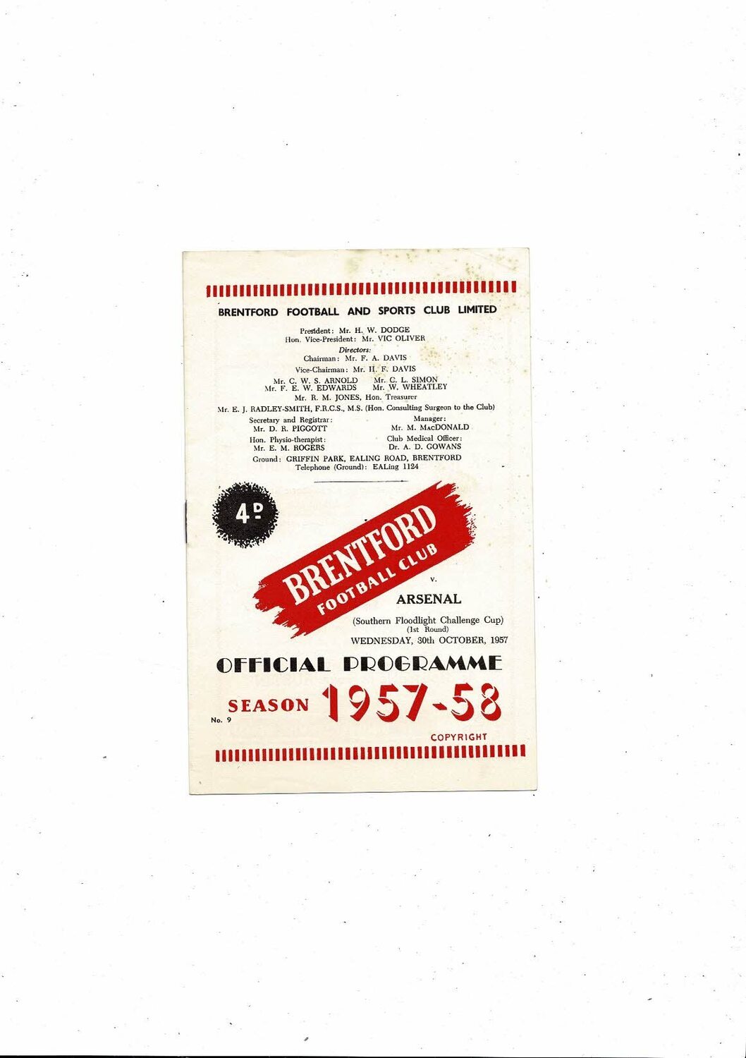 Brentford v Arsenal Southern Floodlight Cup Football Programme 1957/58