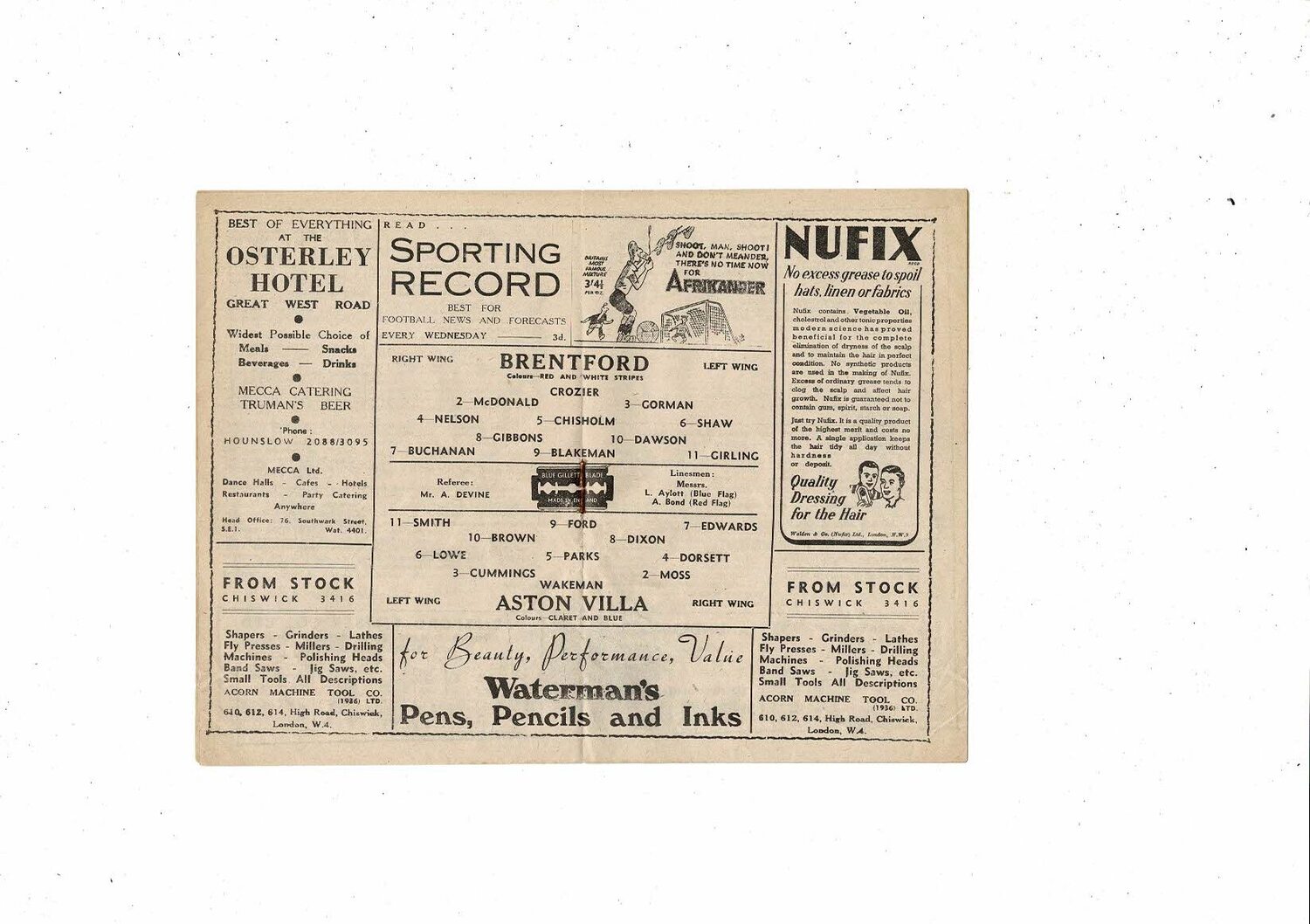 Brentford v Aston Villa Friendly Football Programme 1947/48