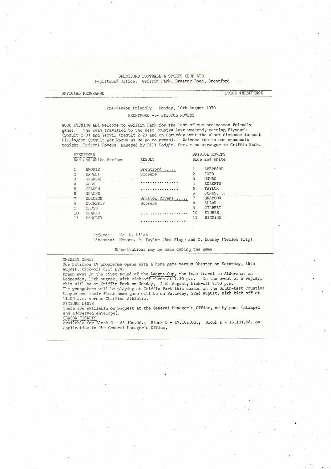 Brentford v Bristol Rovers Friendly Football Programme 1970/71