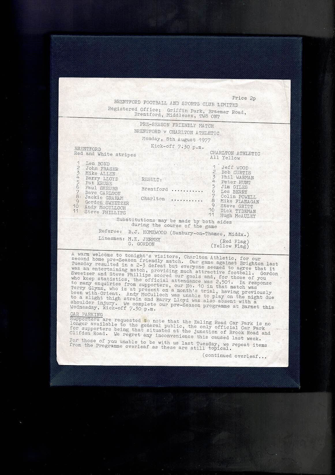 Brentford v Charlton Athletic Friendly Football Programme 1977/78