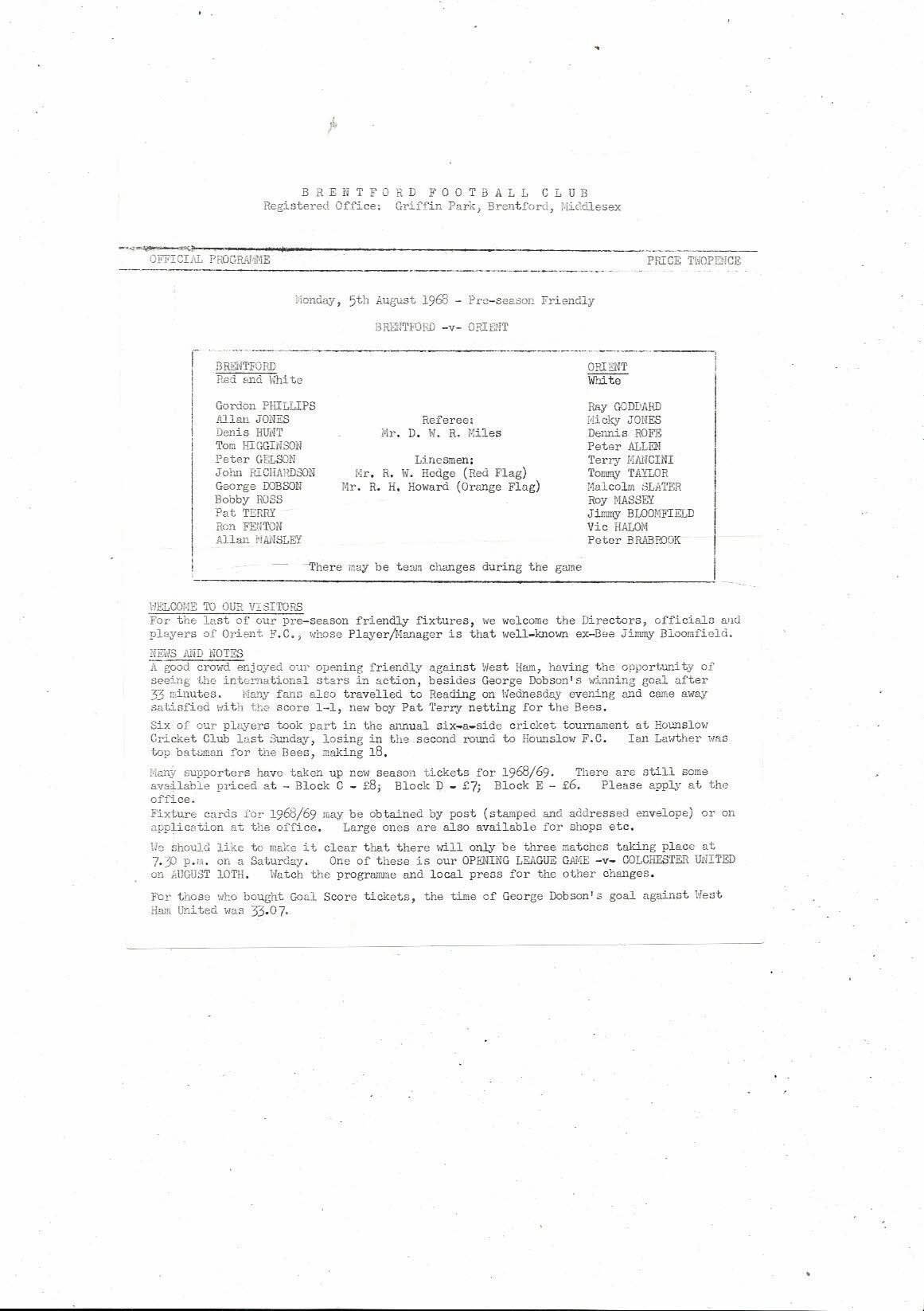 Brentford v Leyton Orient Friendly Football Programme 1968/69