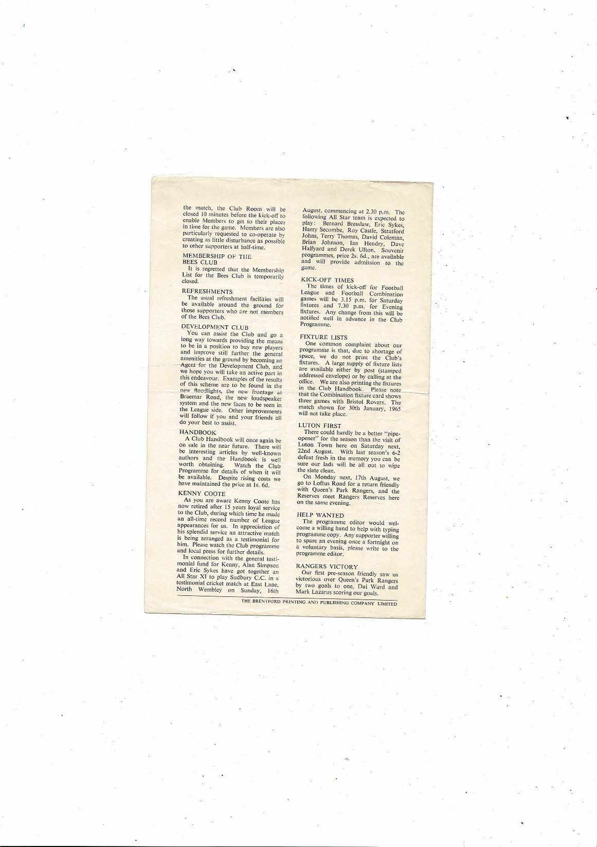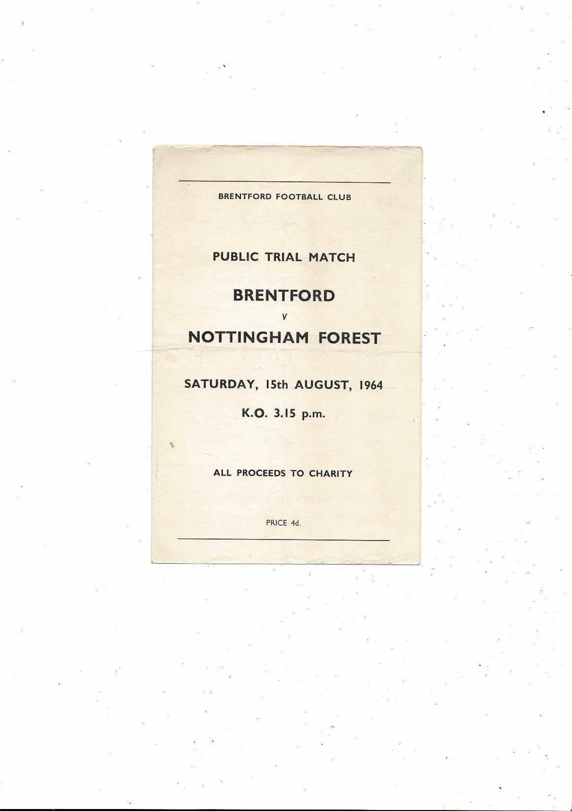 Brentford v Nottingham Forest Public Trial Match Football Programme 1964/65