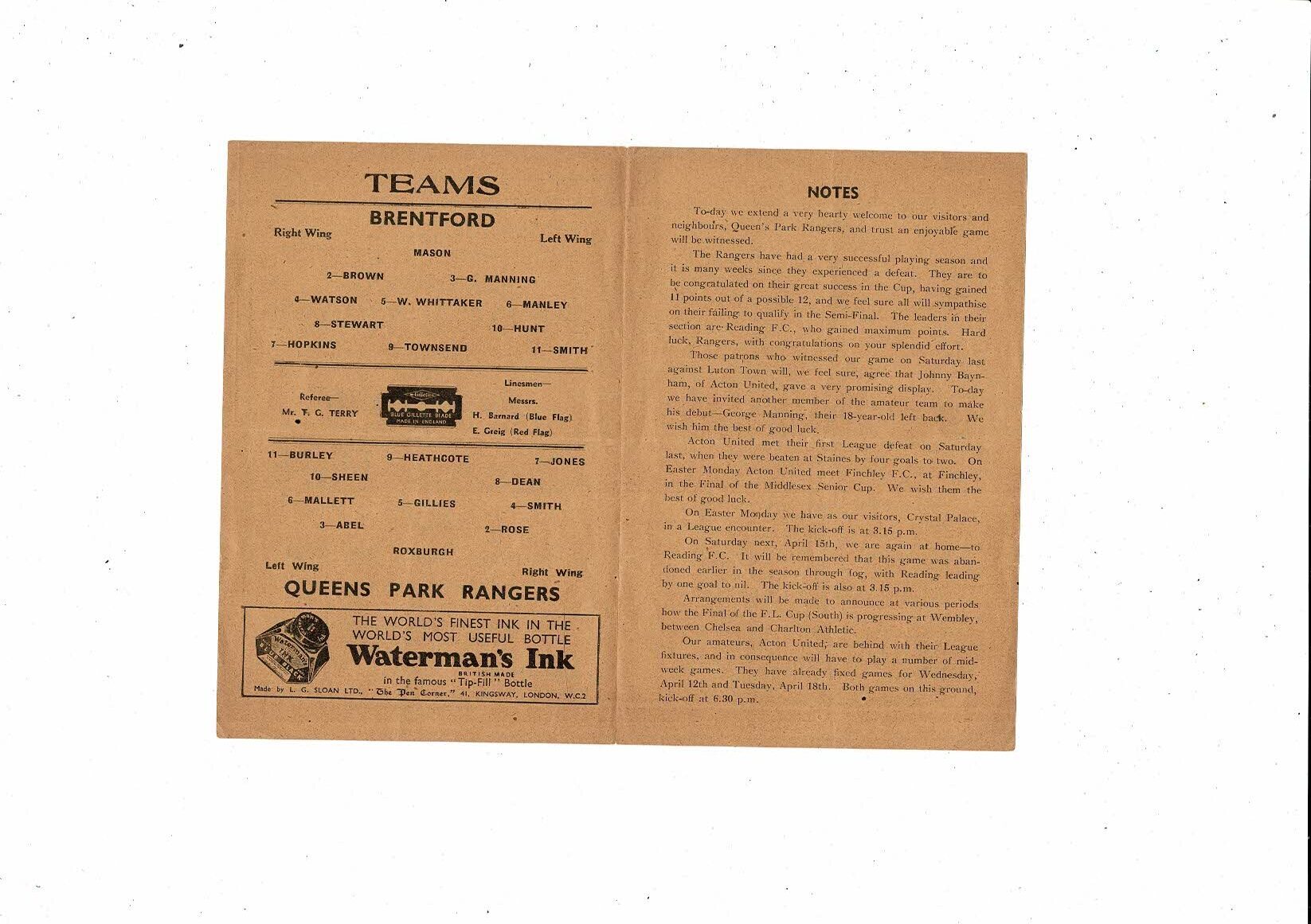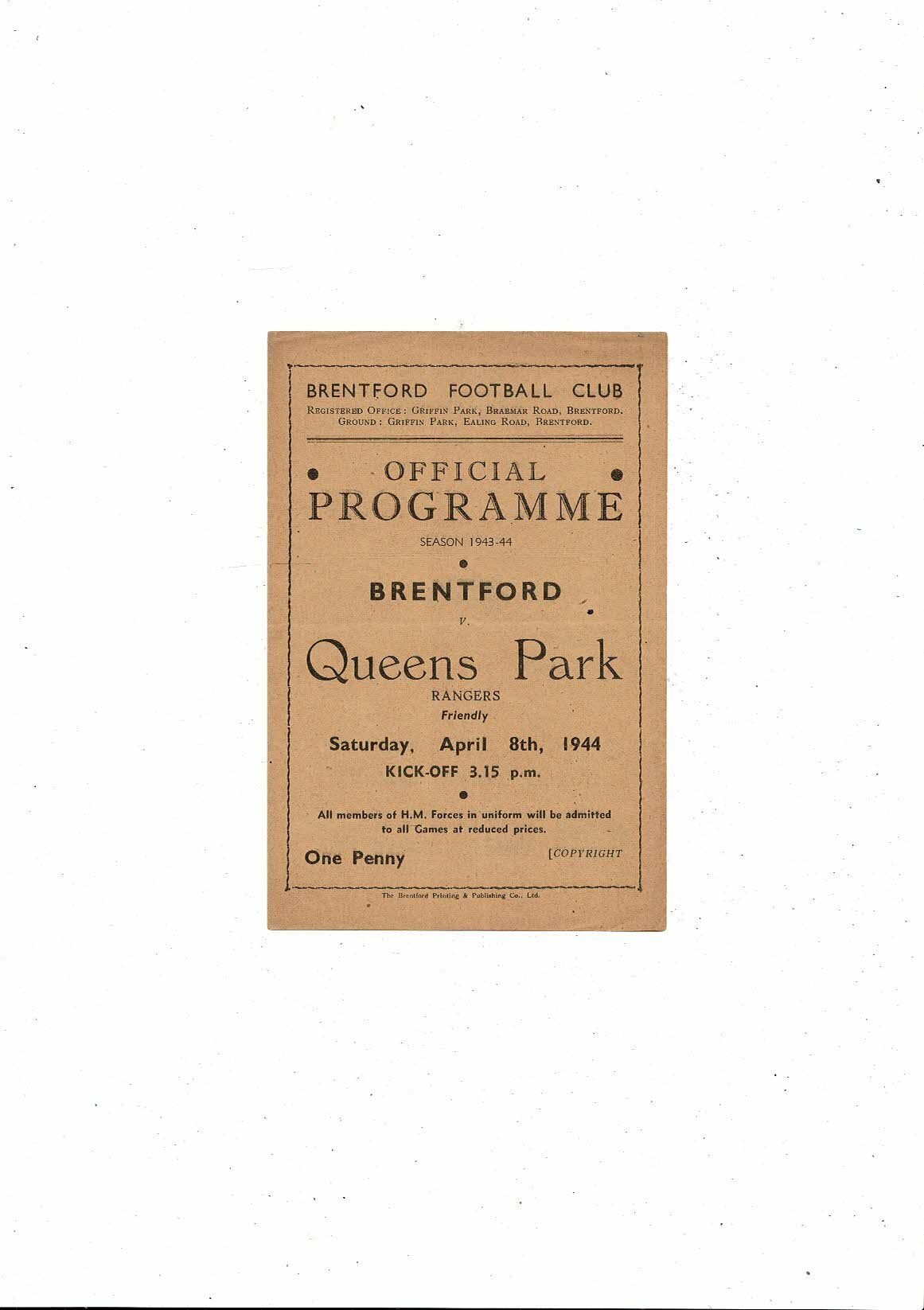 Brentford v Queens Park Rangers Friendly Football Programme 1943/44
