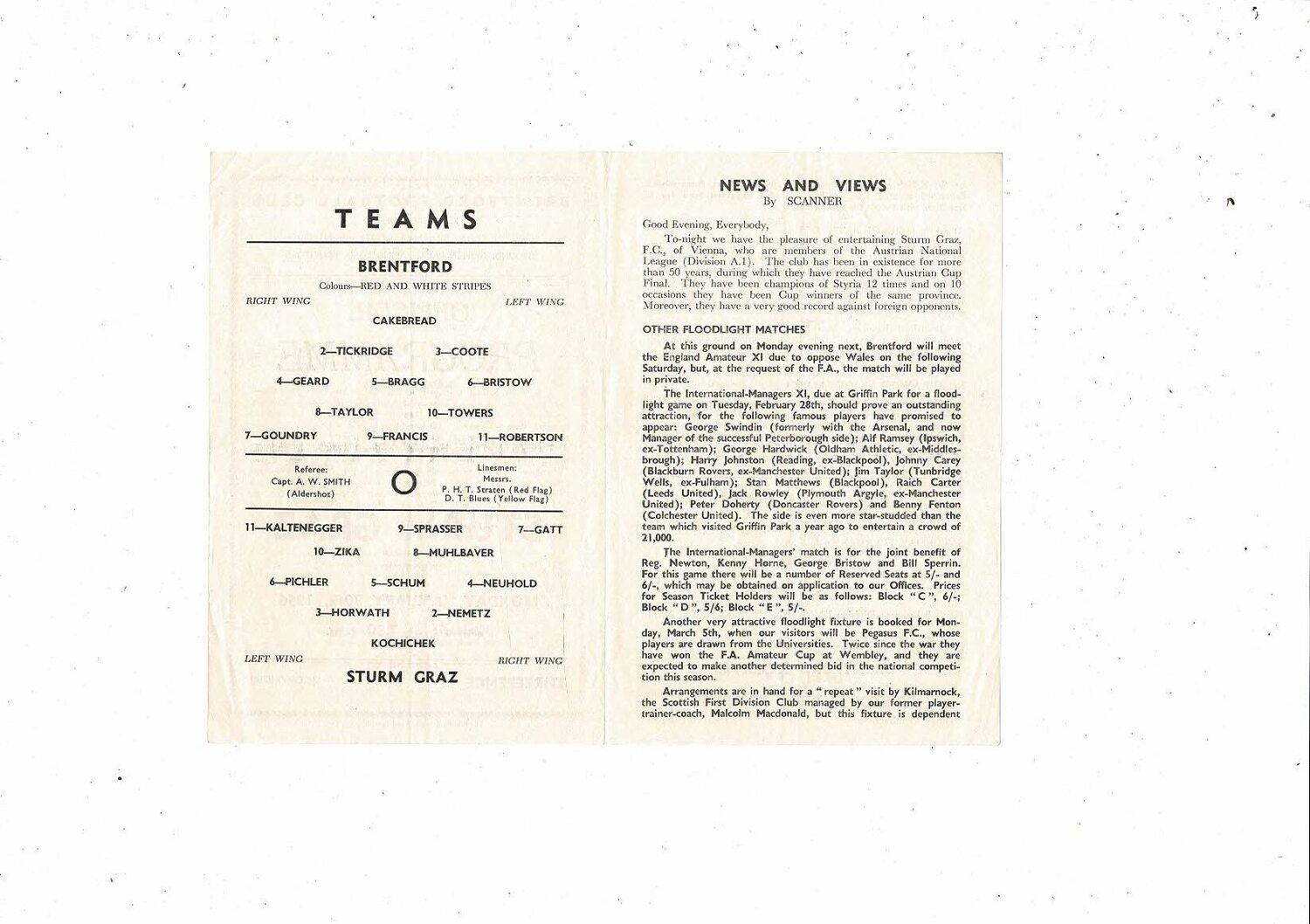 Brentford v Strum Graz Friendly Football Programme 1955/56