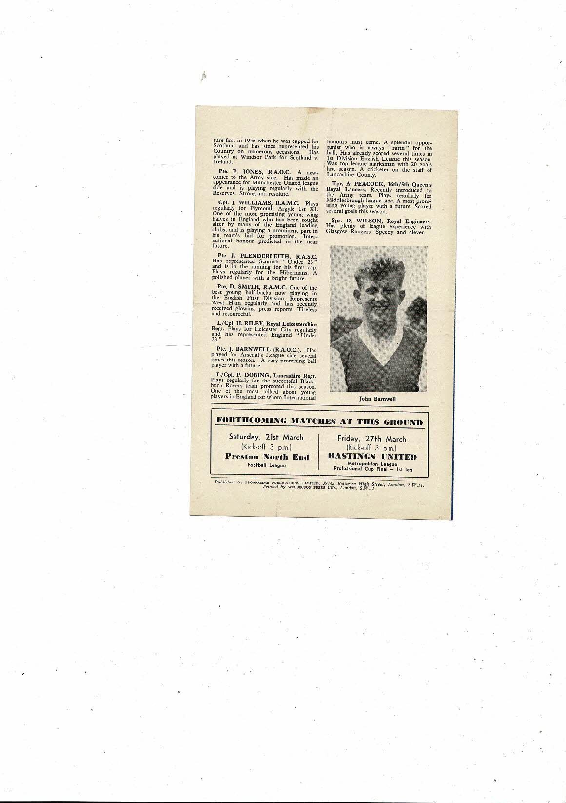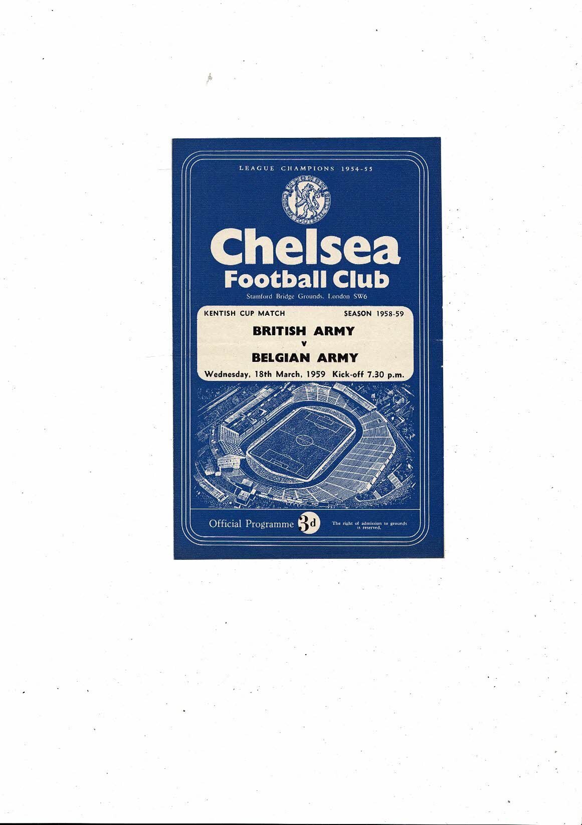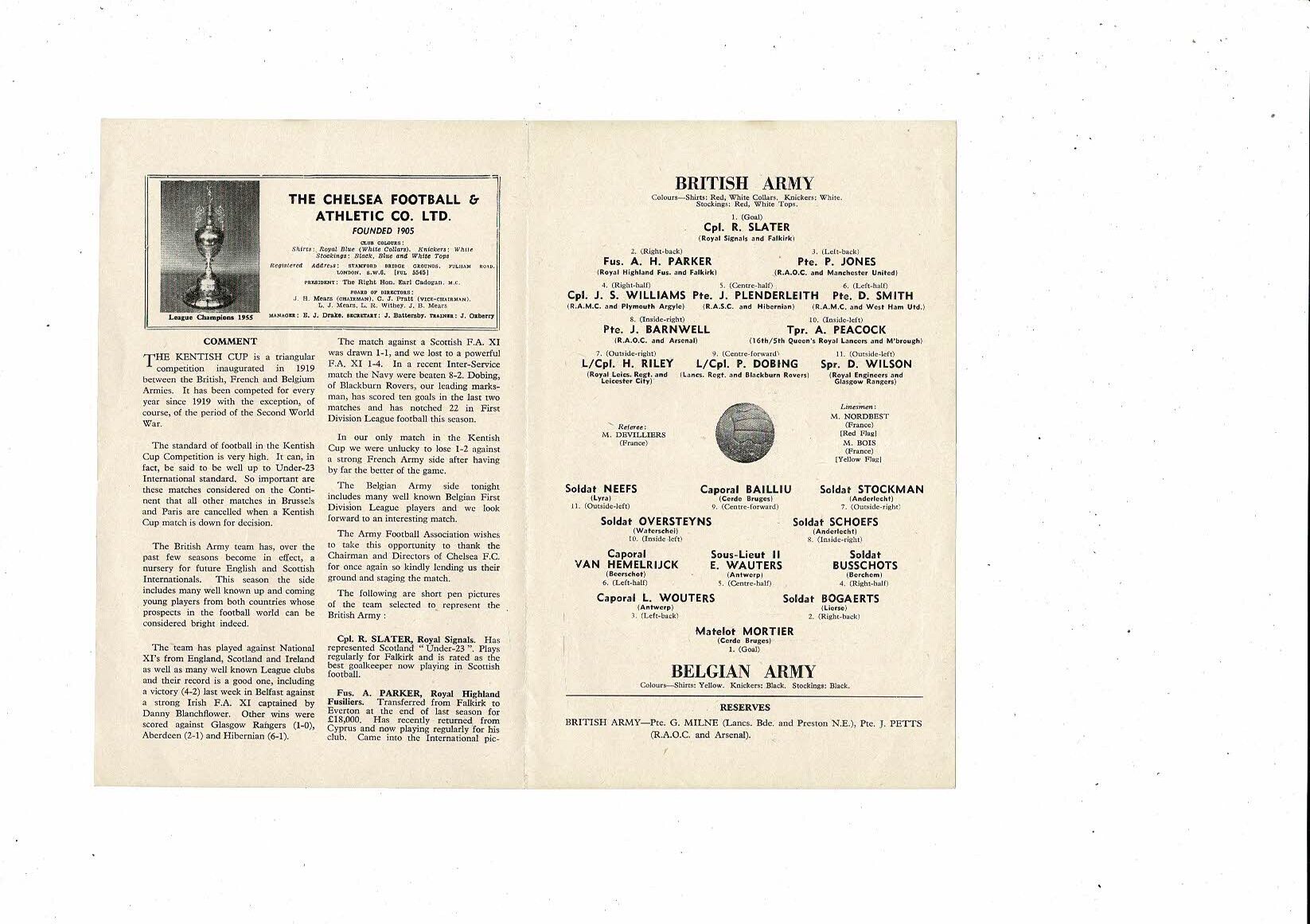 British Army v Belgian Army Kentish Cup Friendly Football Programme 1958/59 @ Chelsea