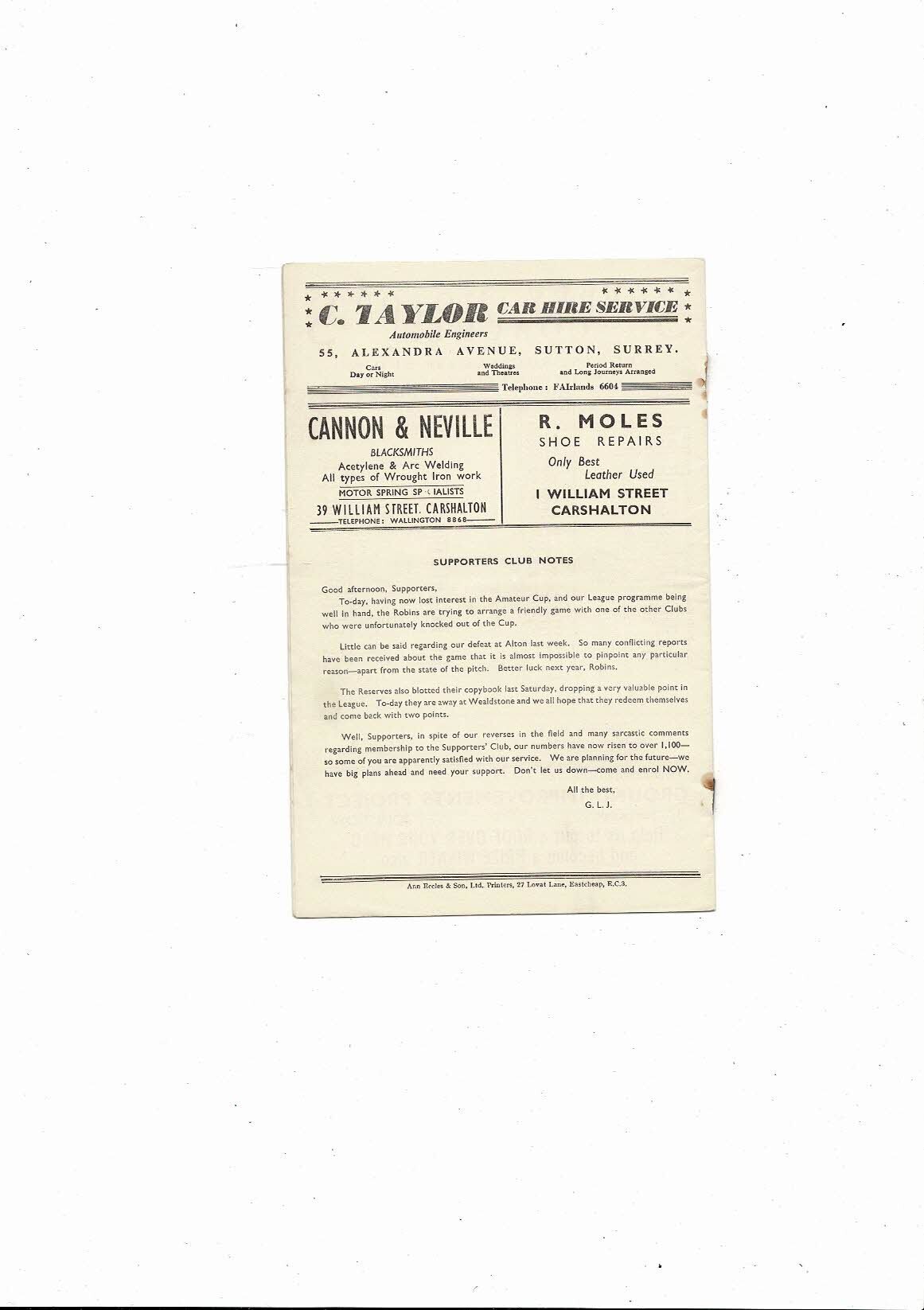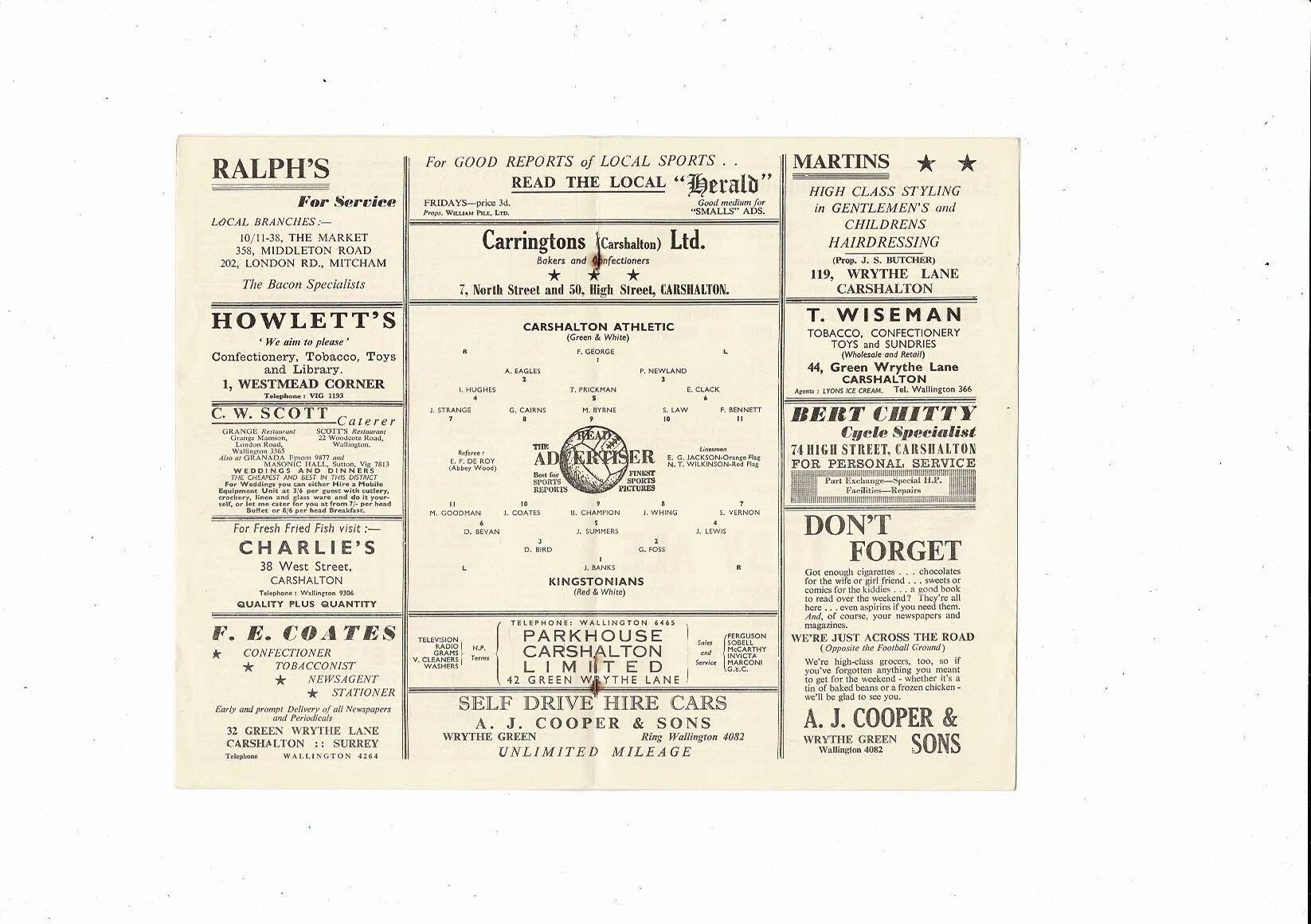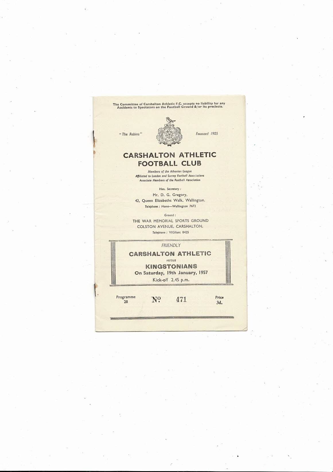 Carshalton Athletic v Kingstonians Friendly Football Programme 1956/57