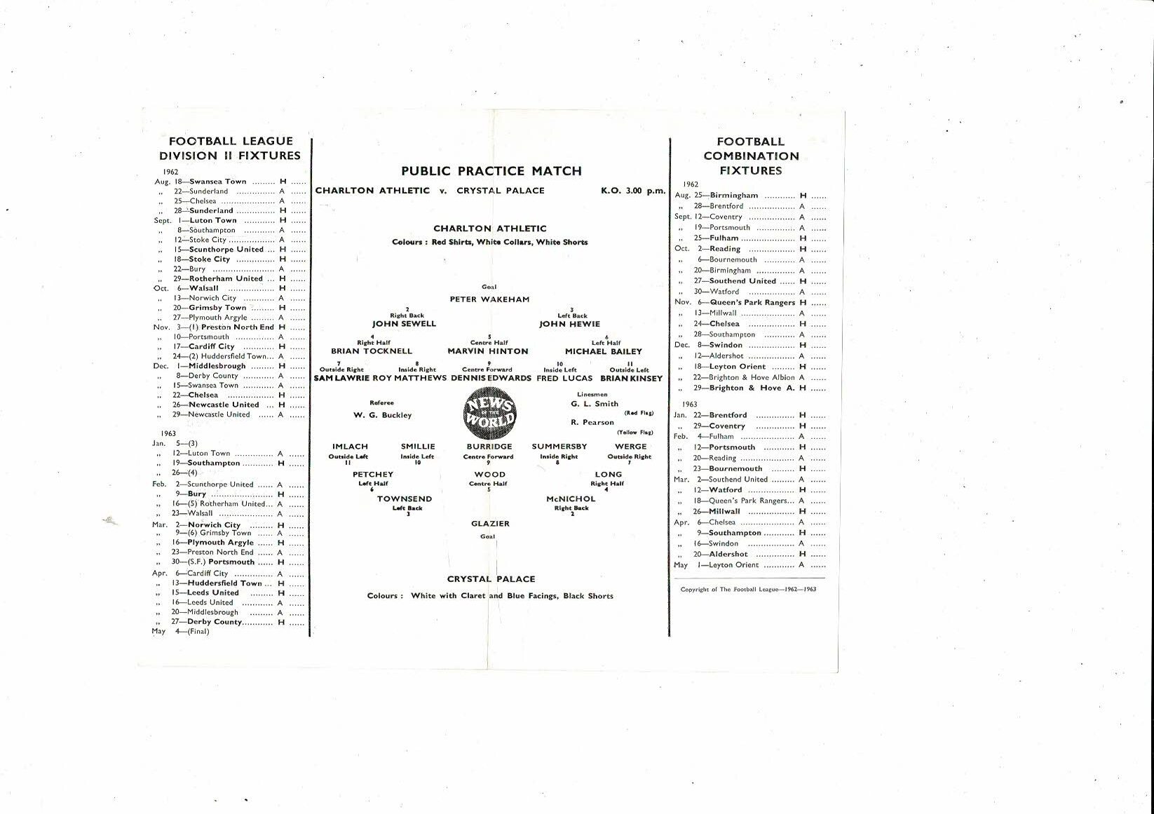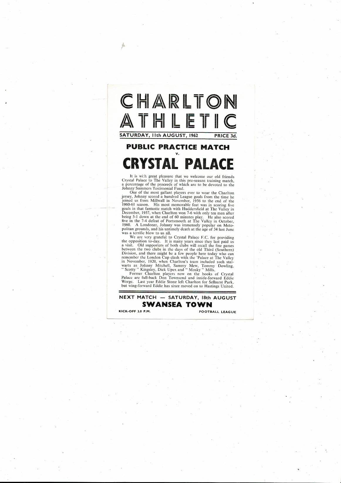Charlton Athletic v Crystal Palace Friendly Football Programme 1962/63