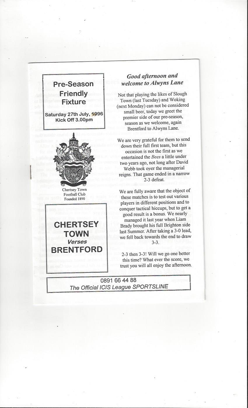 Chertsey Town v Brentford Friendly Football Programme 1996/97