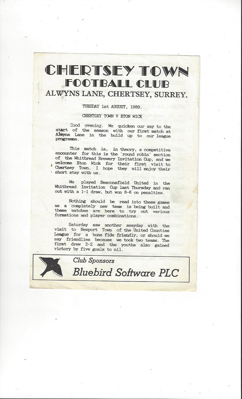 Chertsey Town v Eton Wick Friendly Football Programme 1989/90