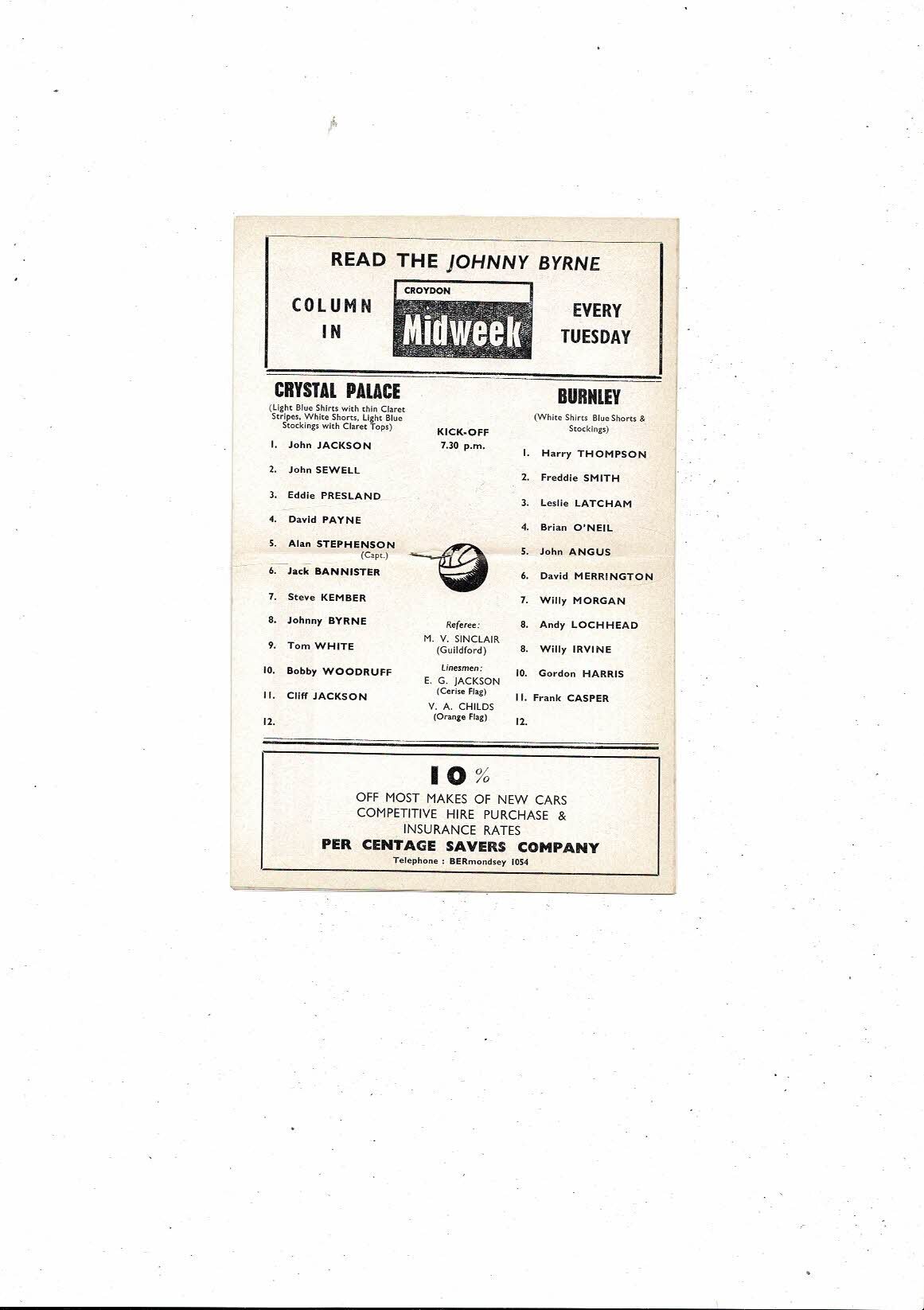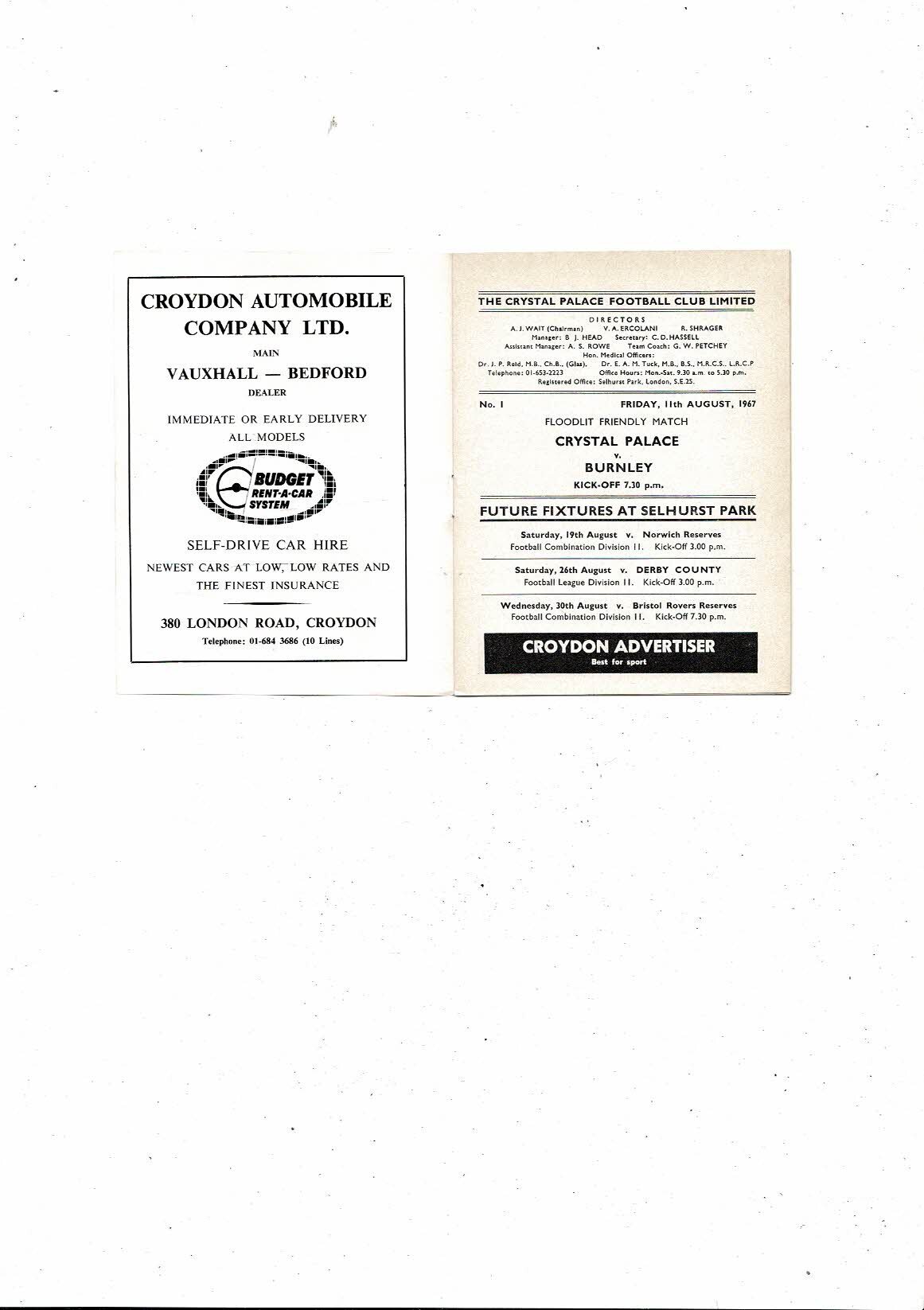 Crystal Palace v Burnley Friendly Football Programme 1967/68