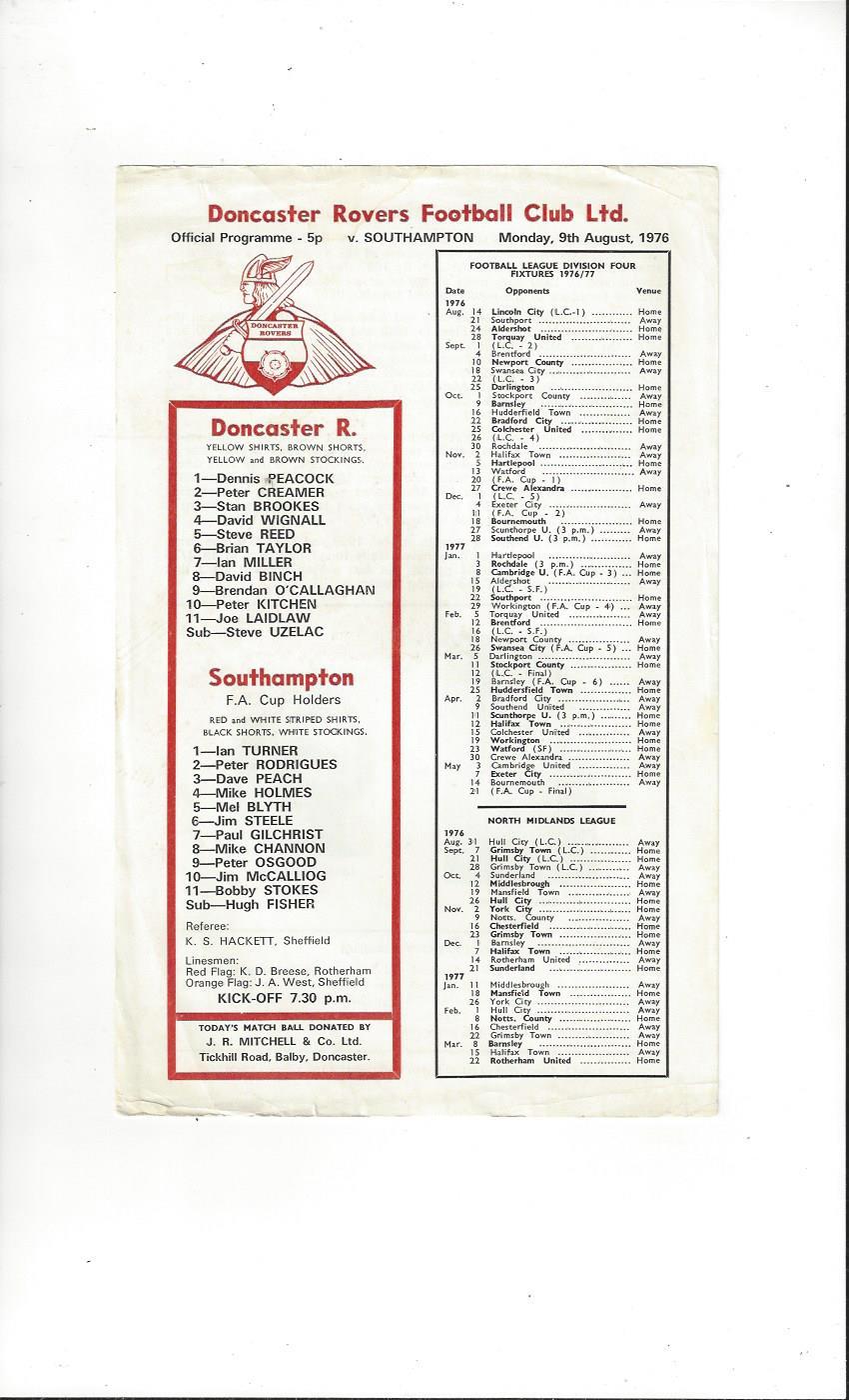 Doncaster Rovers v Southampton Friendly Football Programme 1976/77