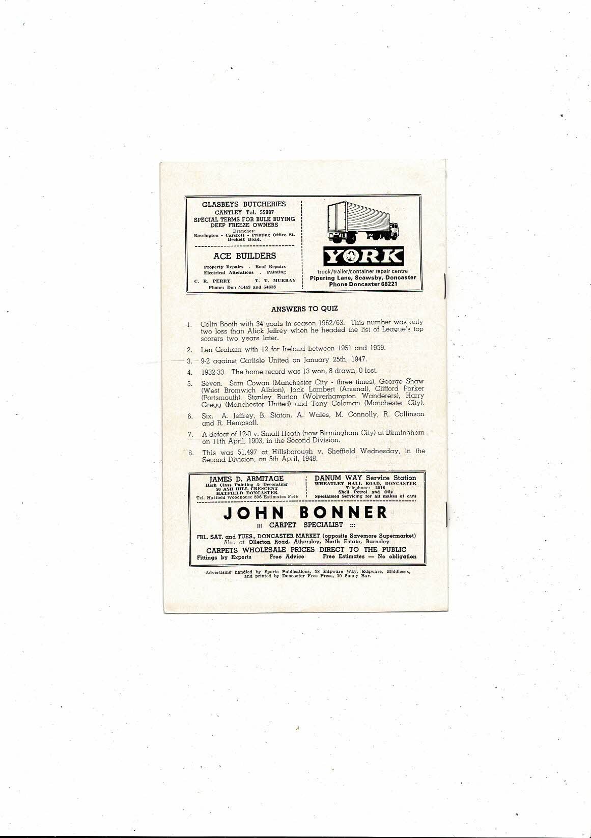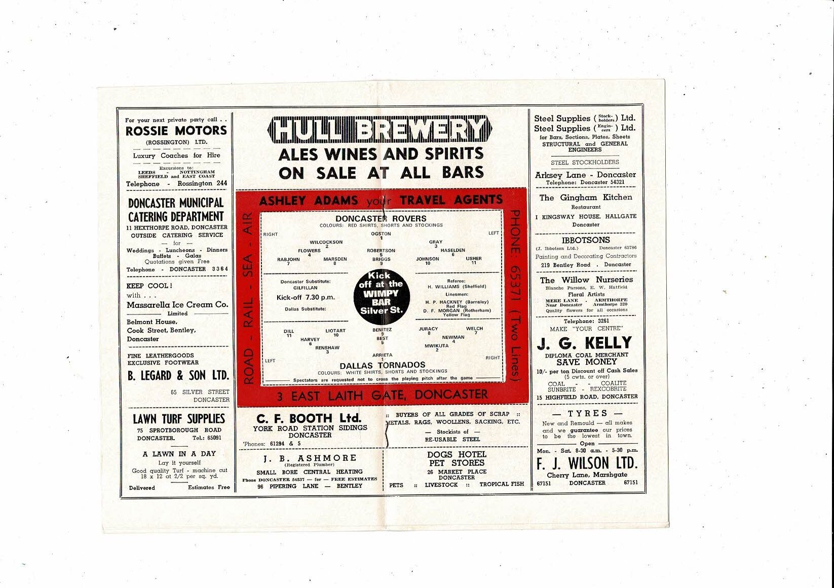 Doncaster v Dallas Tornados Friendly Football Programme 1969/70