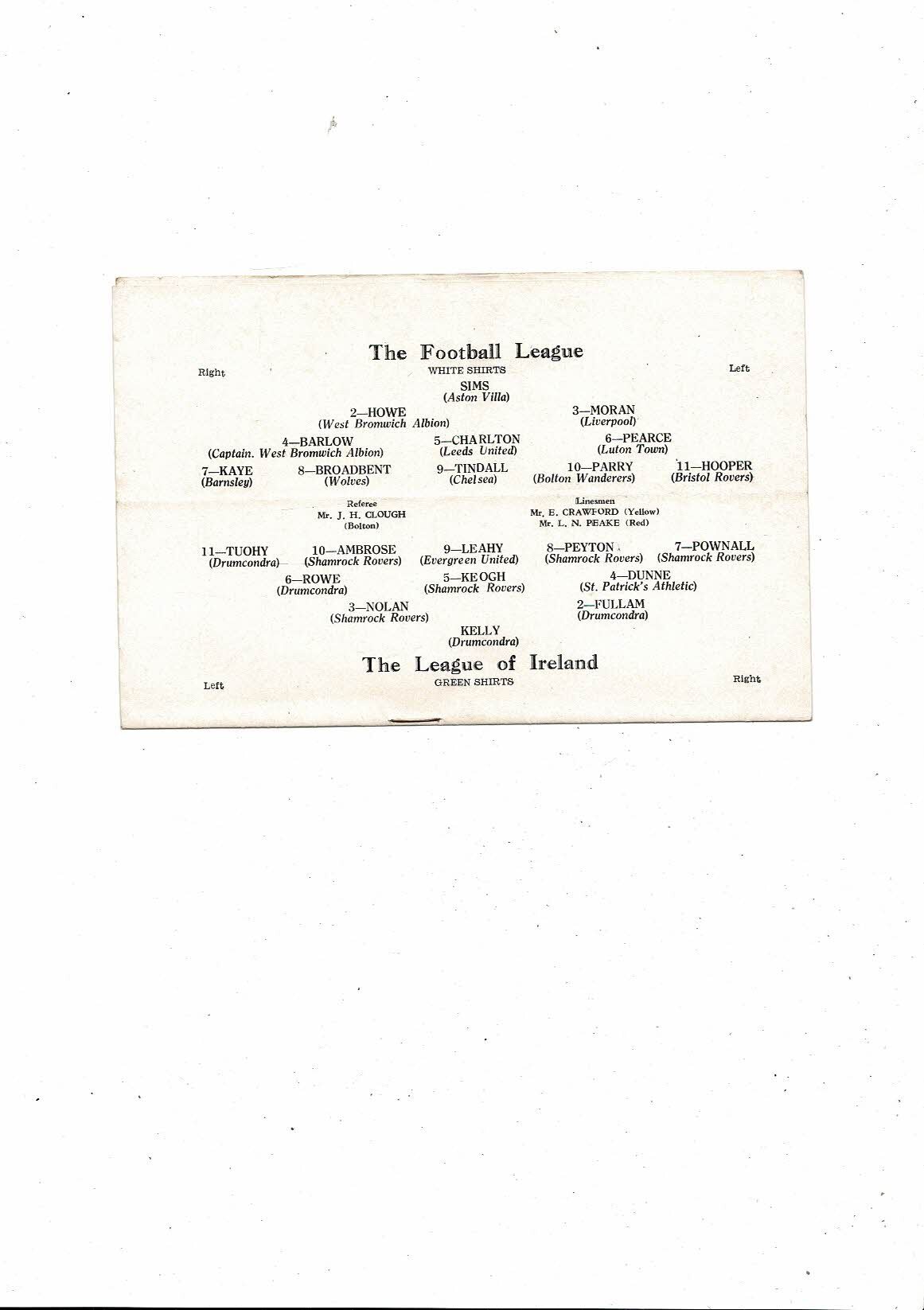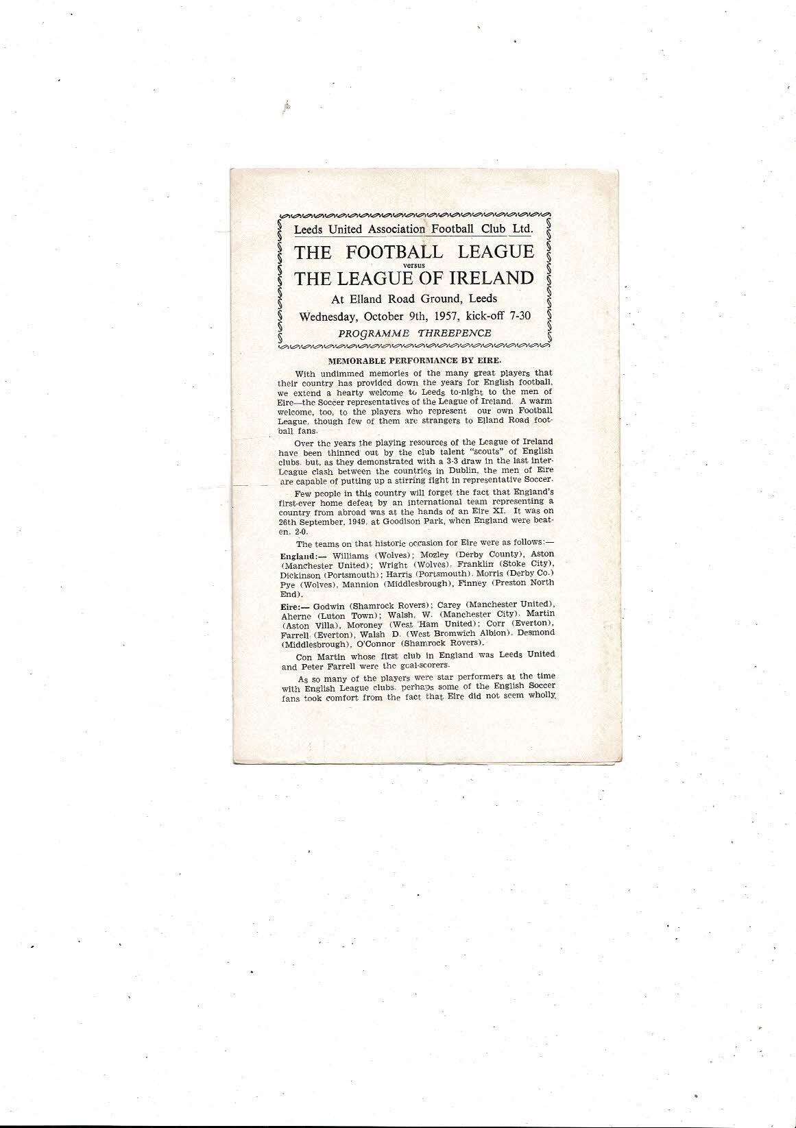 Football League v League of Ireland Friendly Football Programme 1957/58 @ Leeds