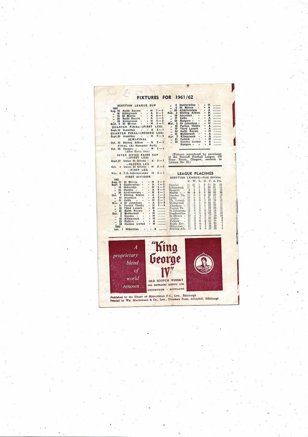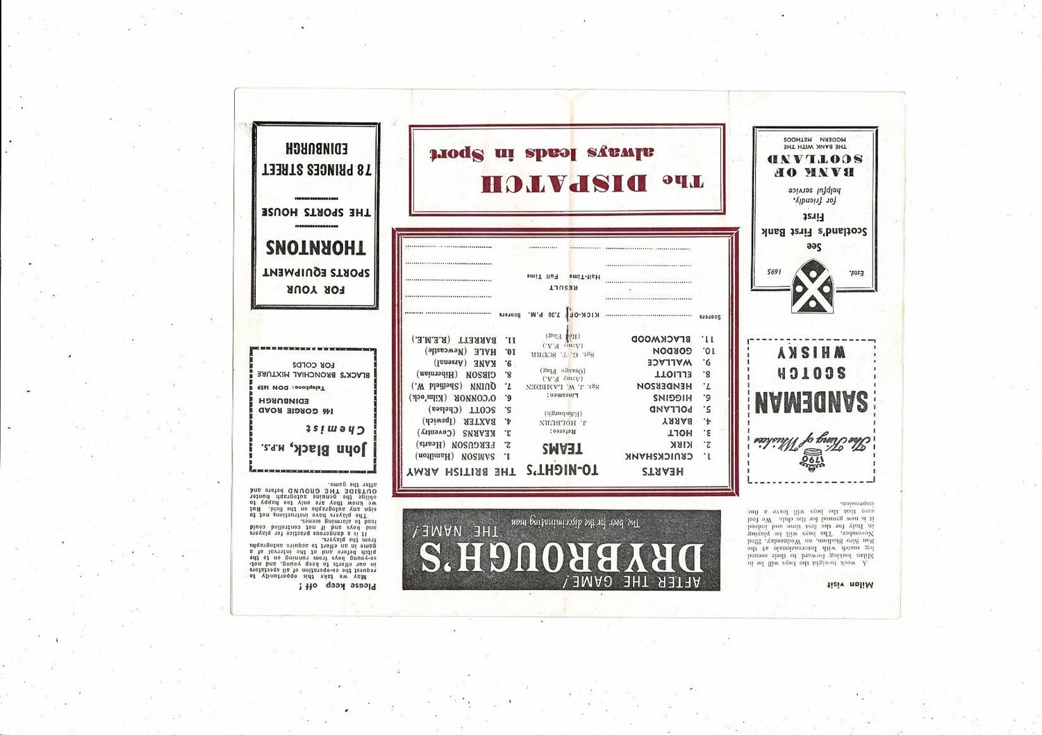 Hearts v The British Army Friendly Football Programme 1961/62