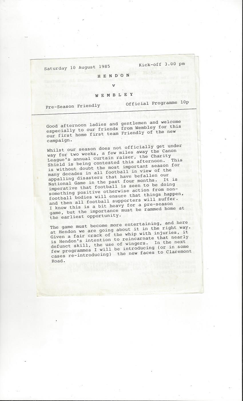 Hendon v Wembley Friendly Football Programme 1985/86