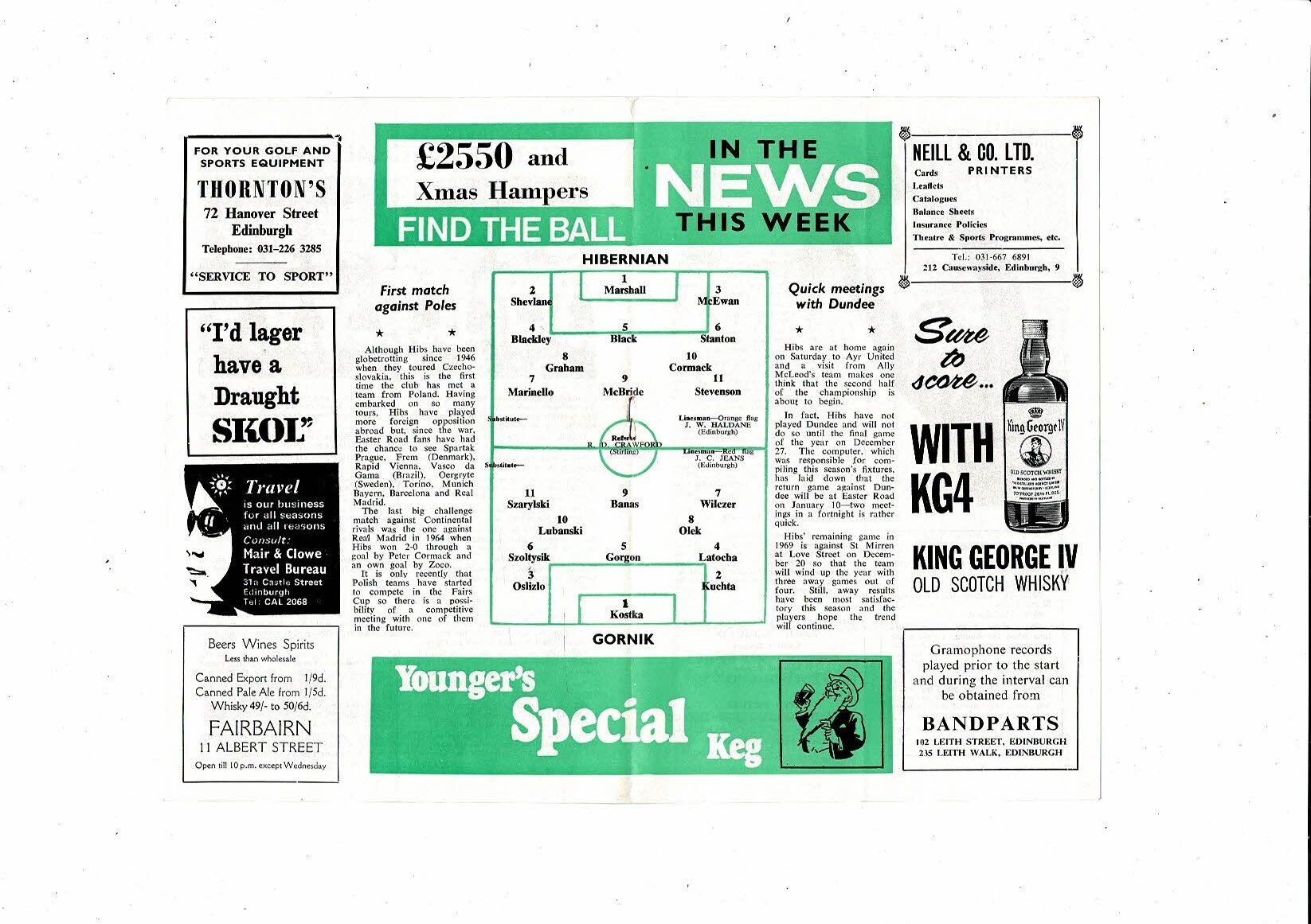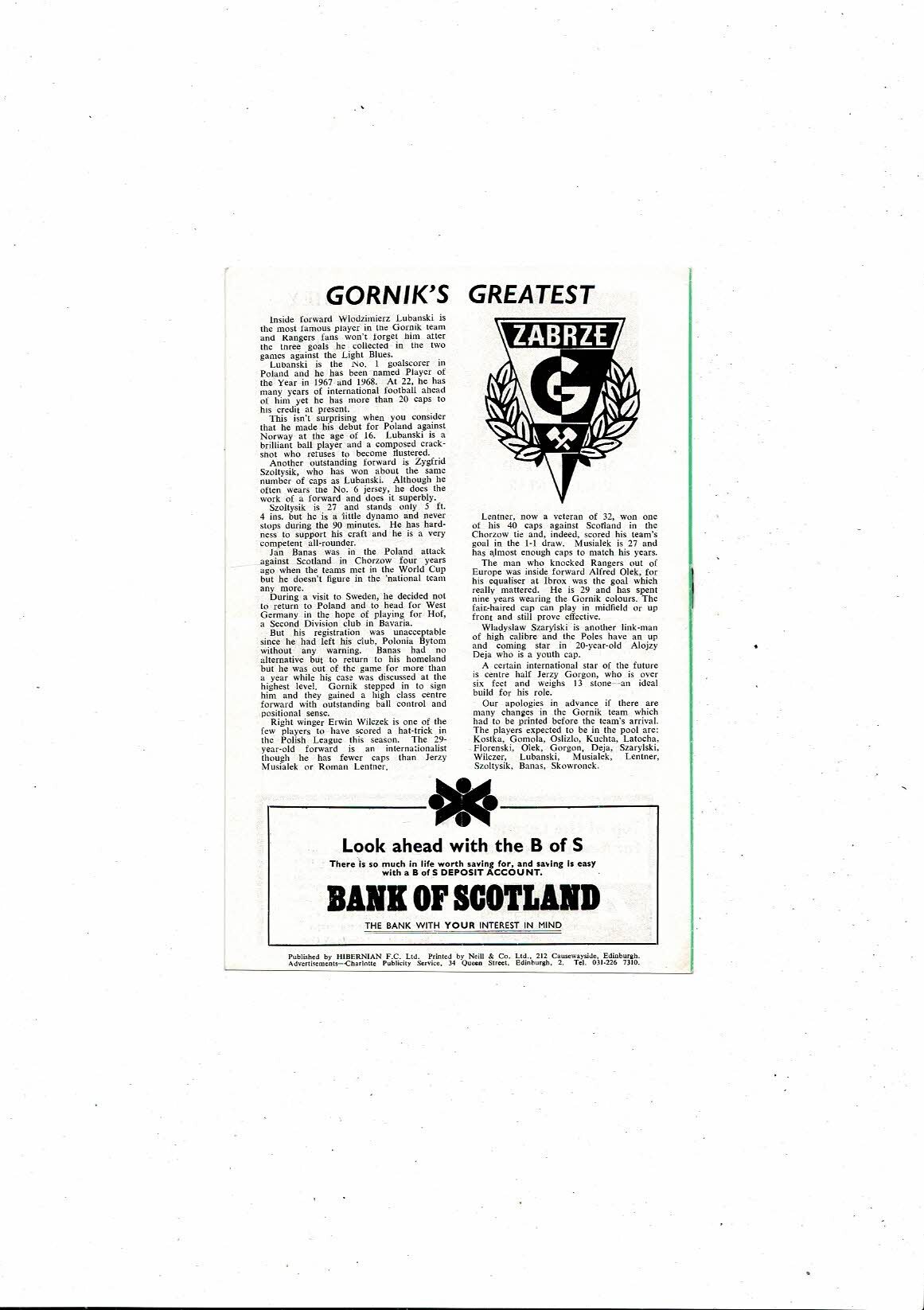 Hibernian v Gornik Friendly Football Programme 1969/70