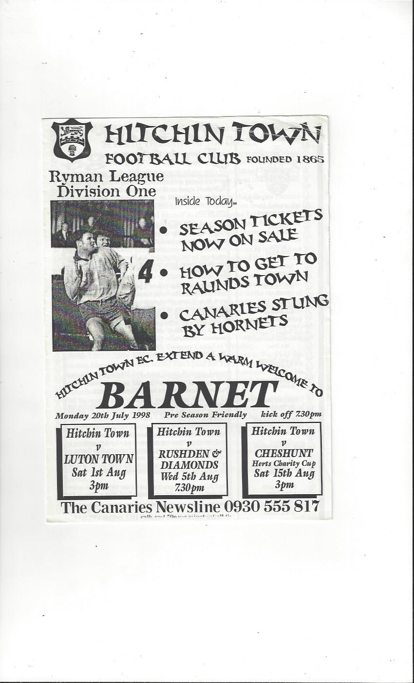 Hitchin Town v Barnet Friendly Football Programme 1998/99