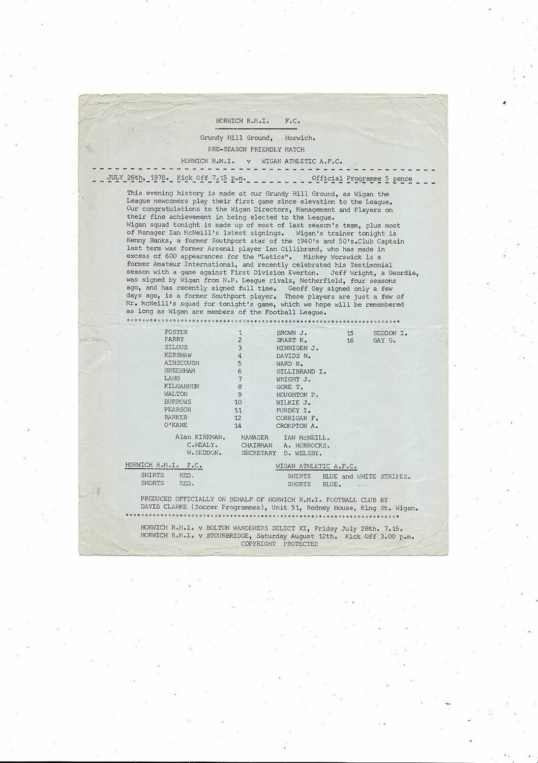 Horwich RMI v Wigan Athletic Friendly Football Programme 1978/79