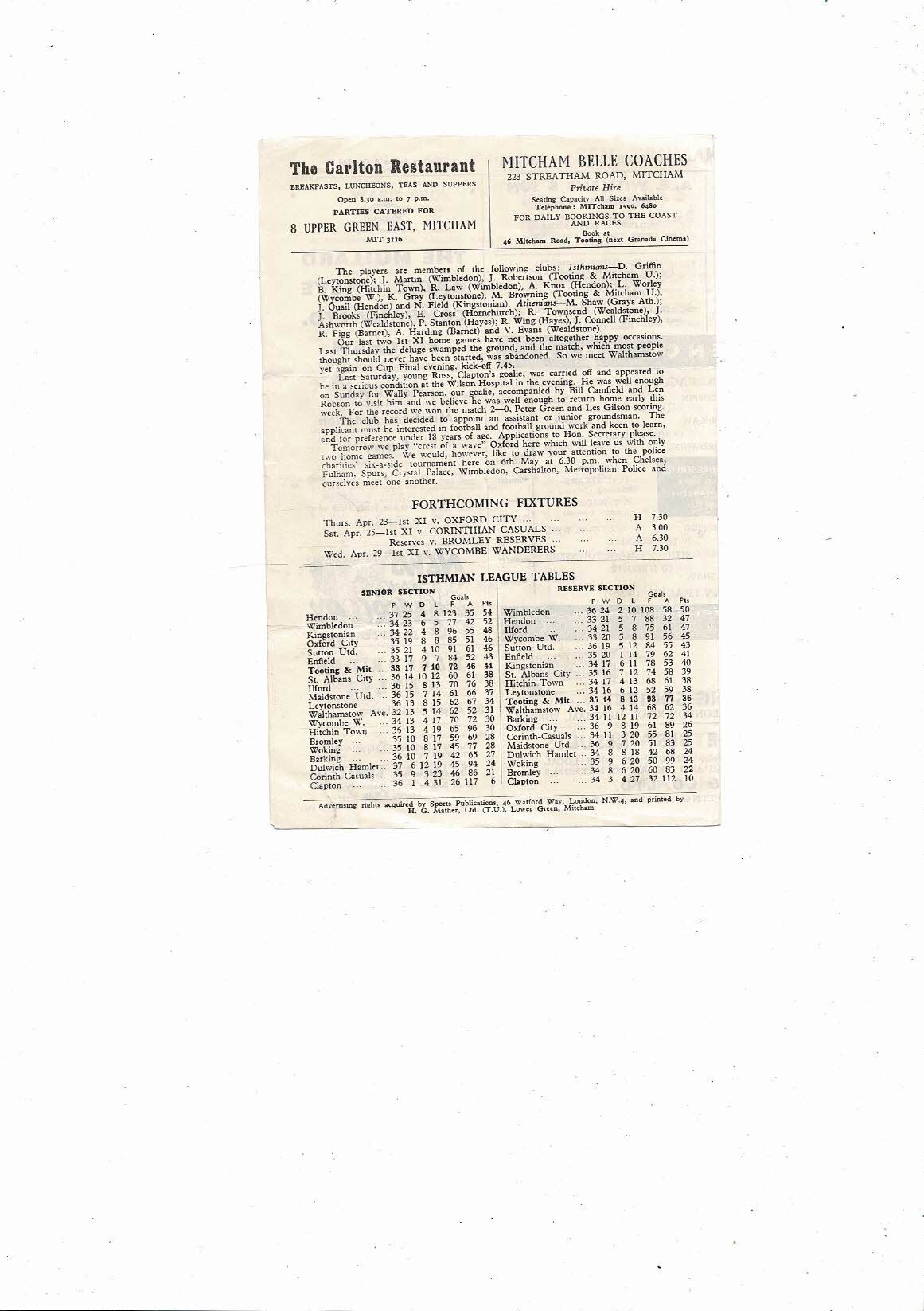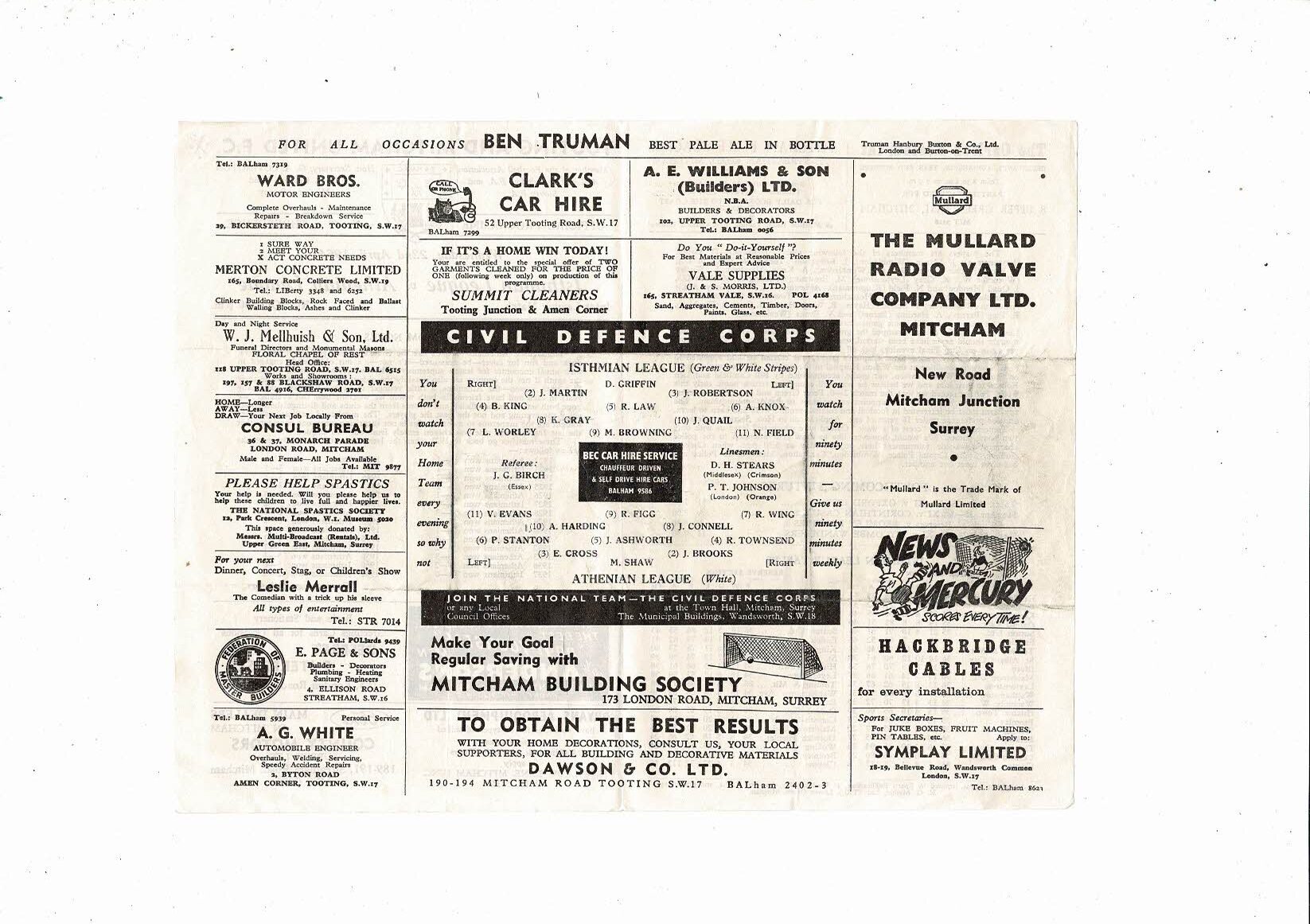 Isthmian League v Athenian League Friendly Football Programme 1963/64 @ Tooting
