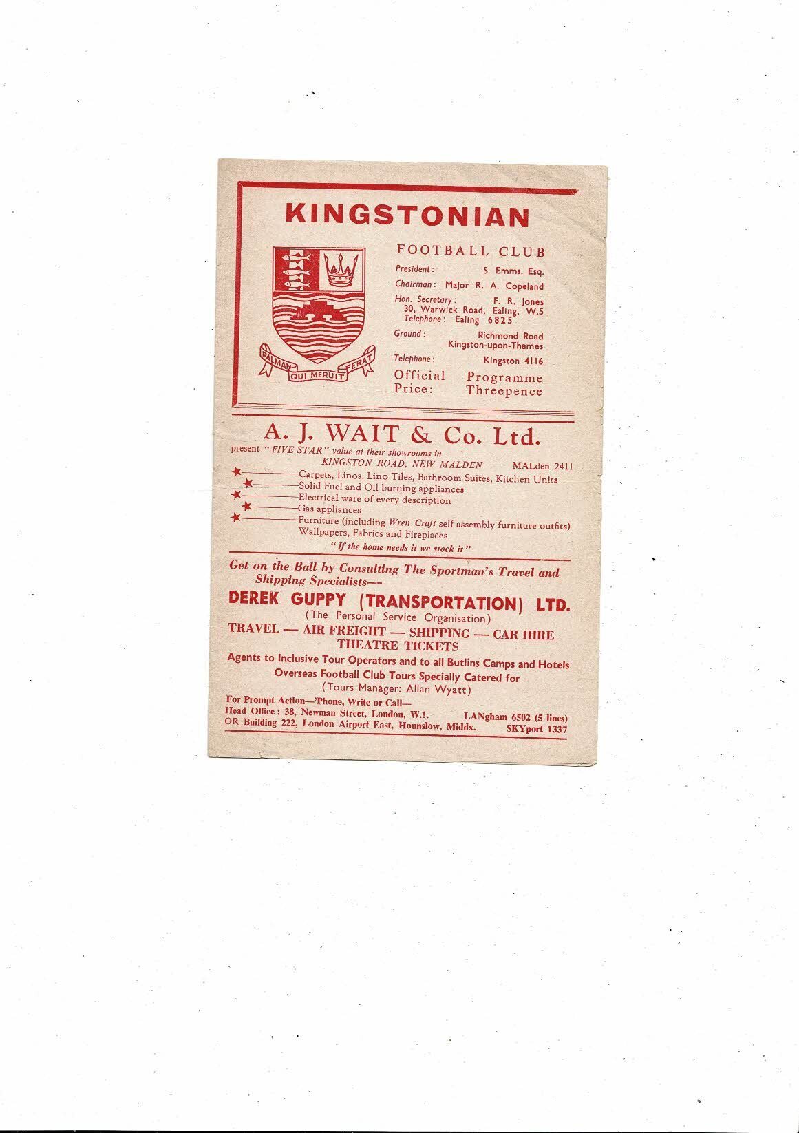 Kingstonian v Clydach United Friendly Football Programme 1961/62