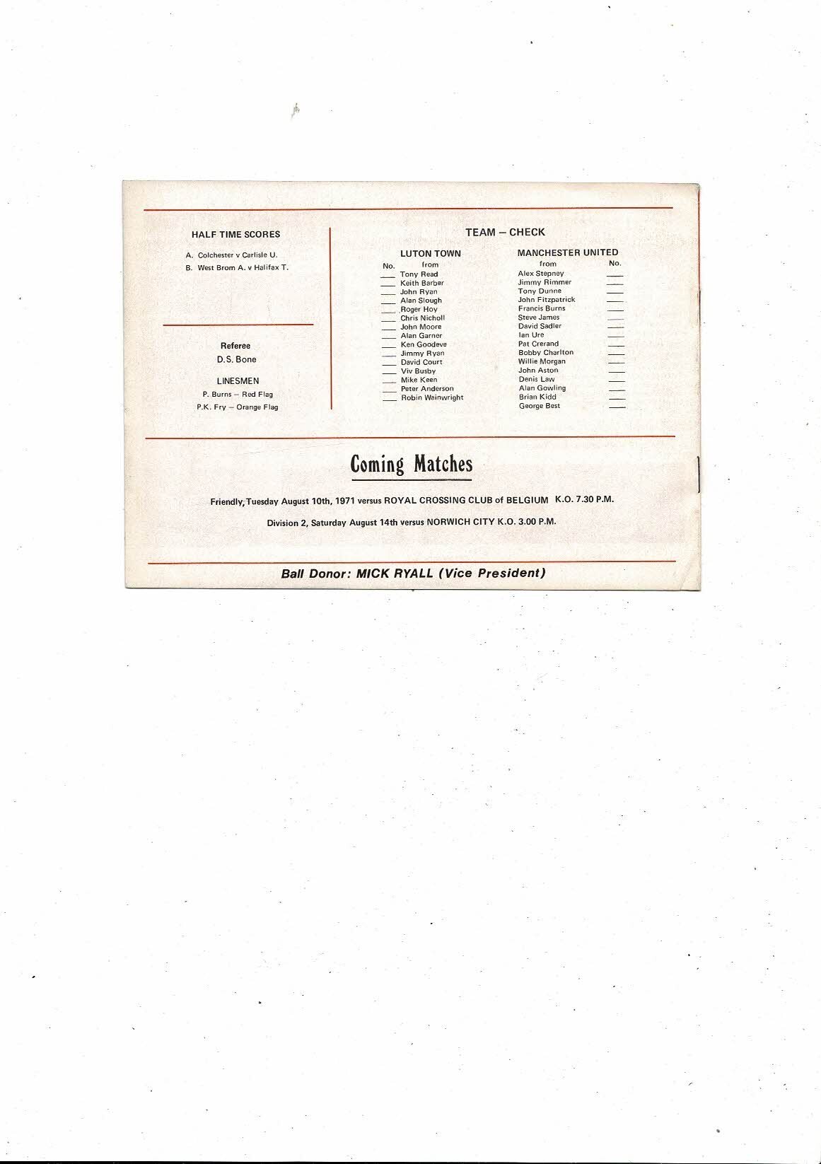 Luton Town v Manchester United Friendly Football Programme 1971/72