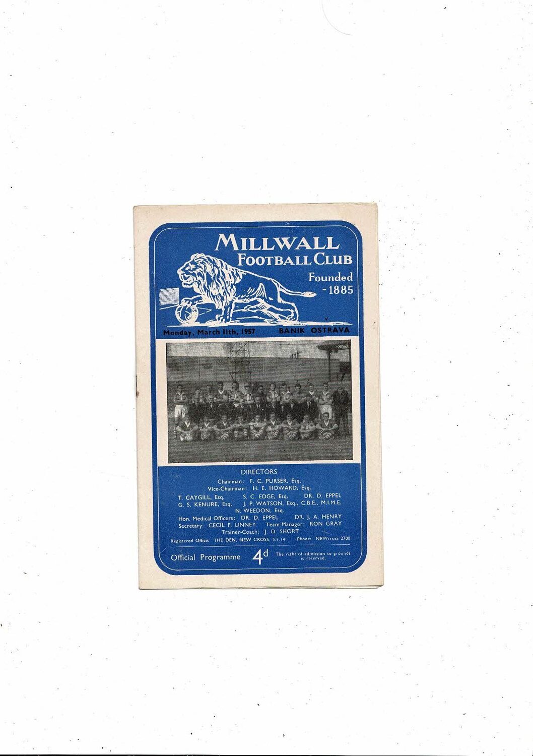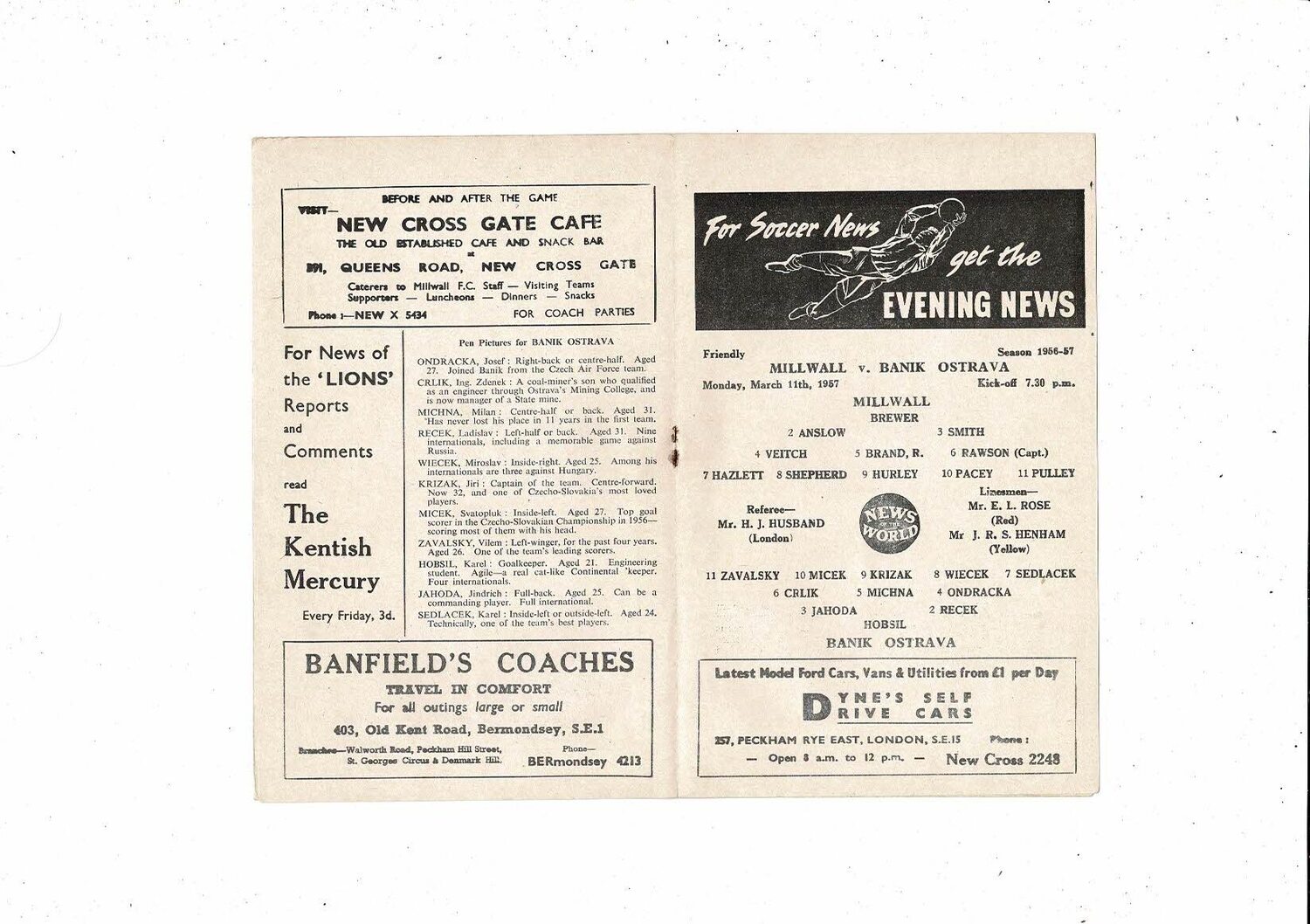 Millwall v Banik Ostrava Friendly Football Programme 1956/57