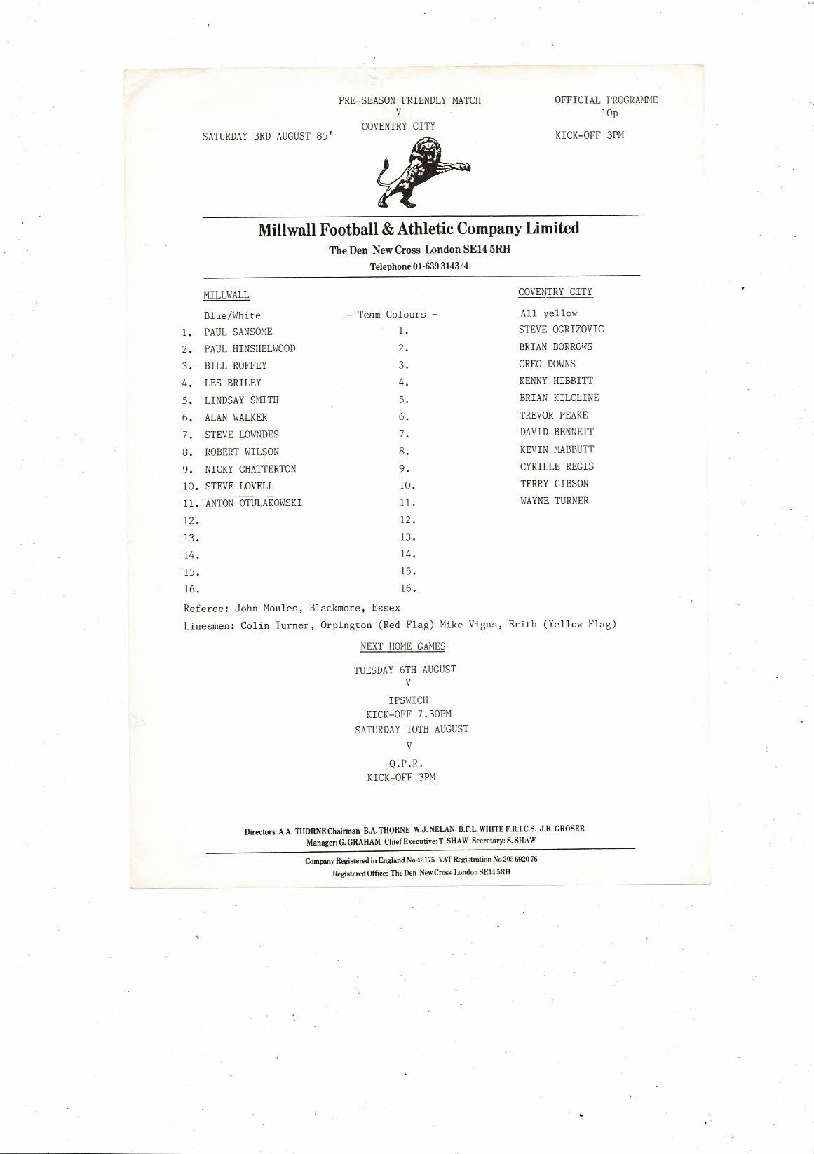 Millwall v Coventry City Friendly Football Programme 1985/86