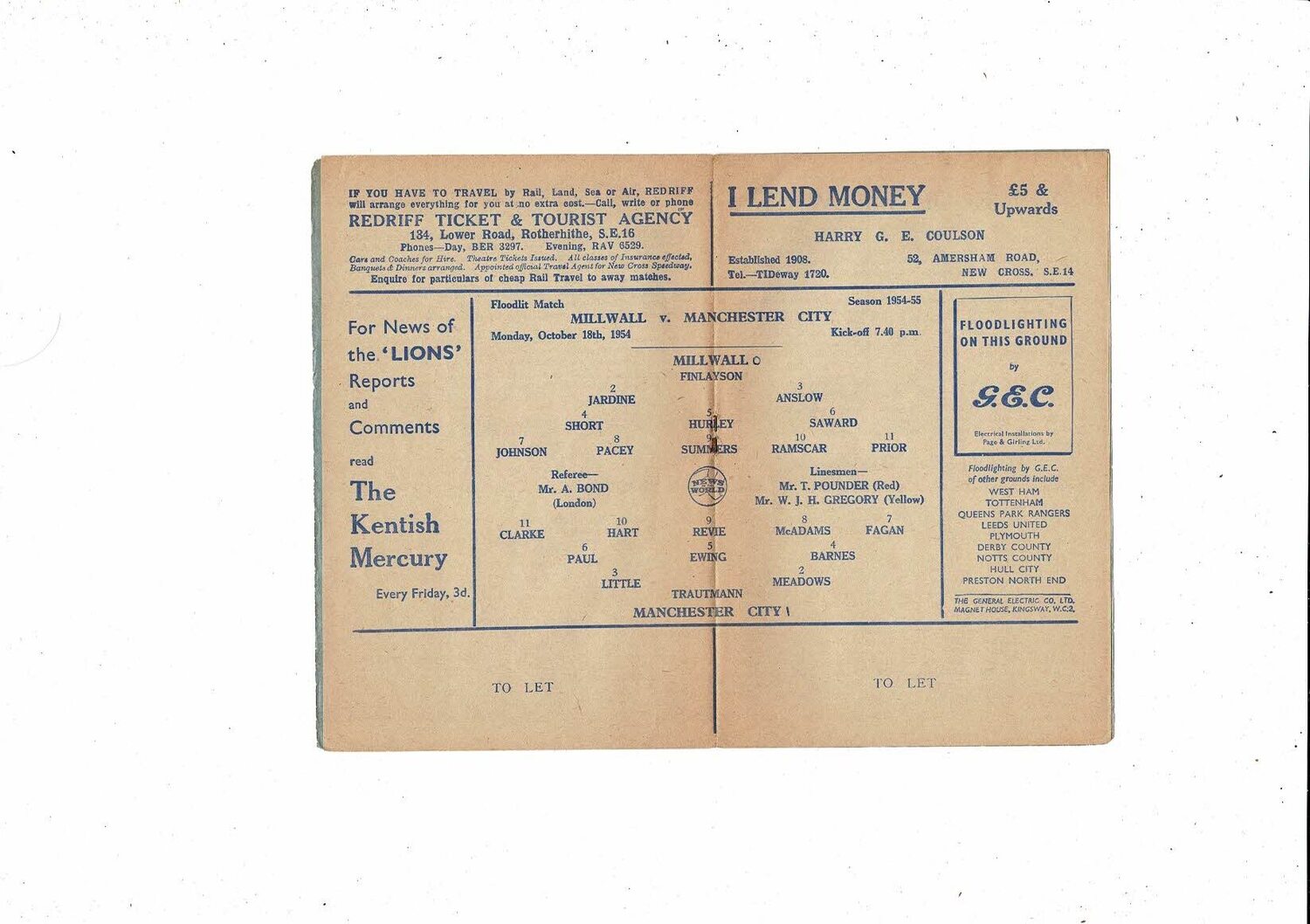 Millwall v Manchester City Friendly Football Programme 1954/55