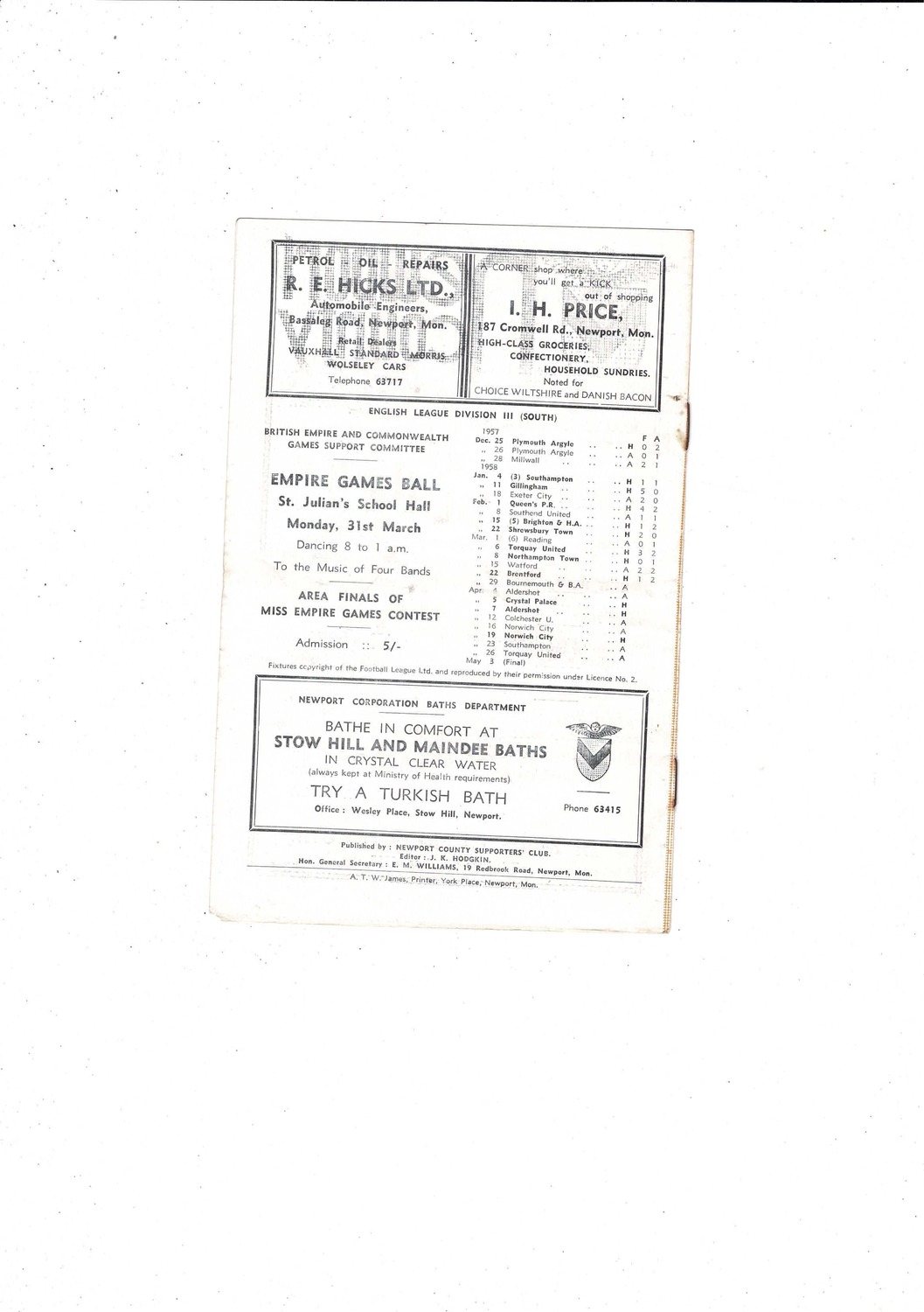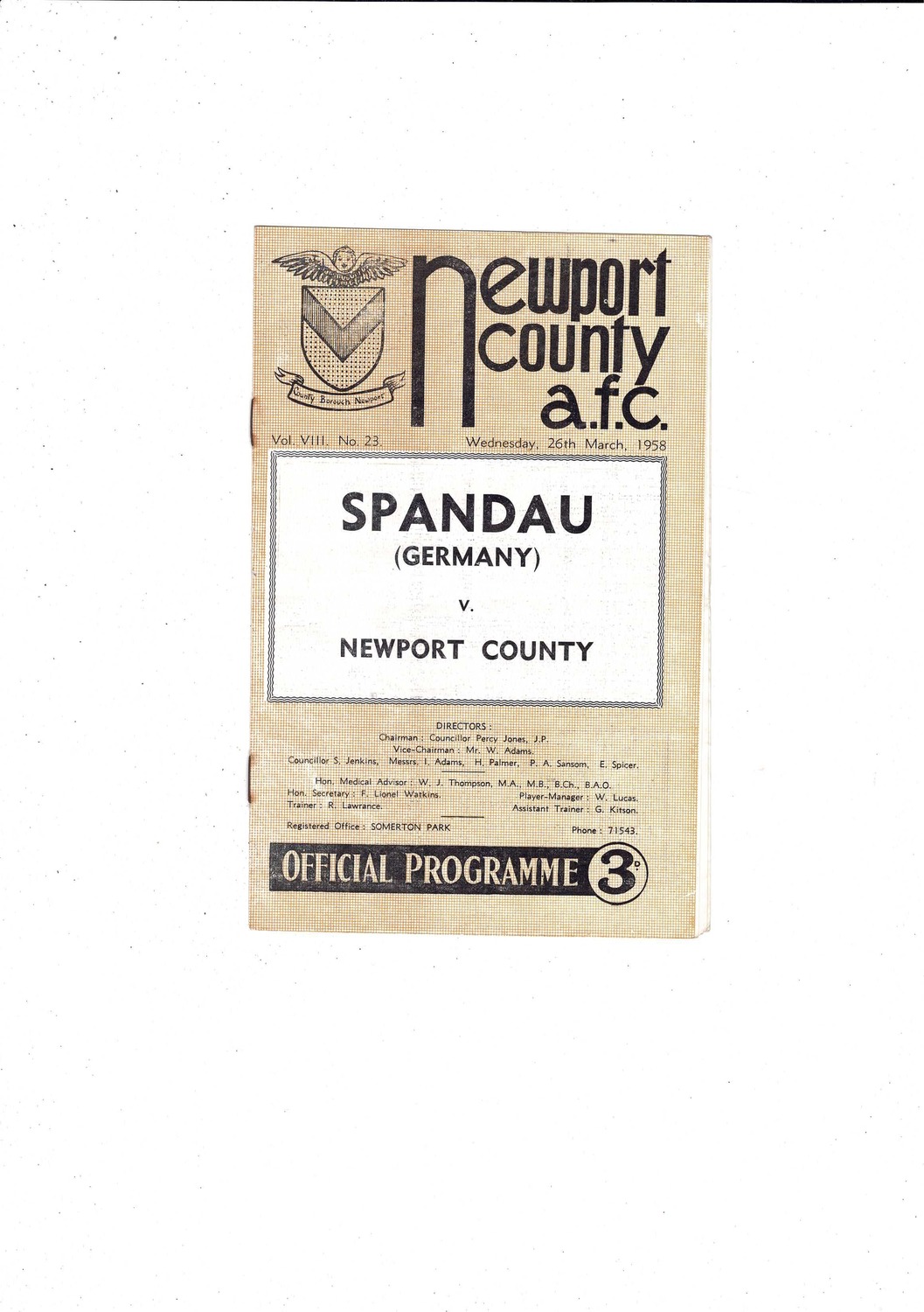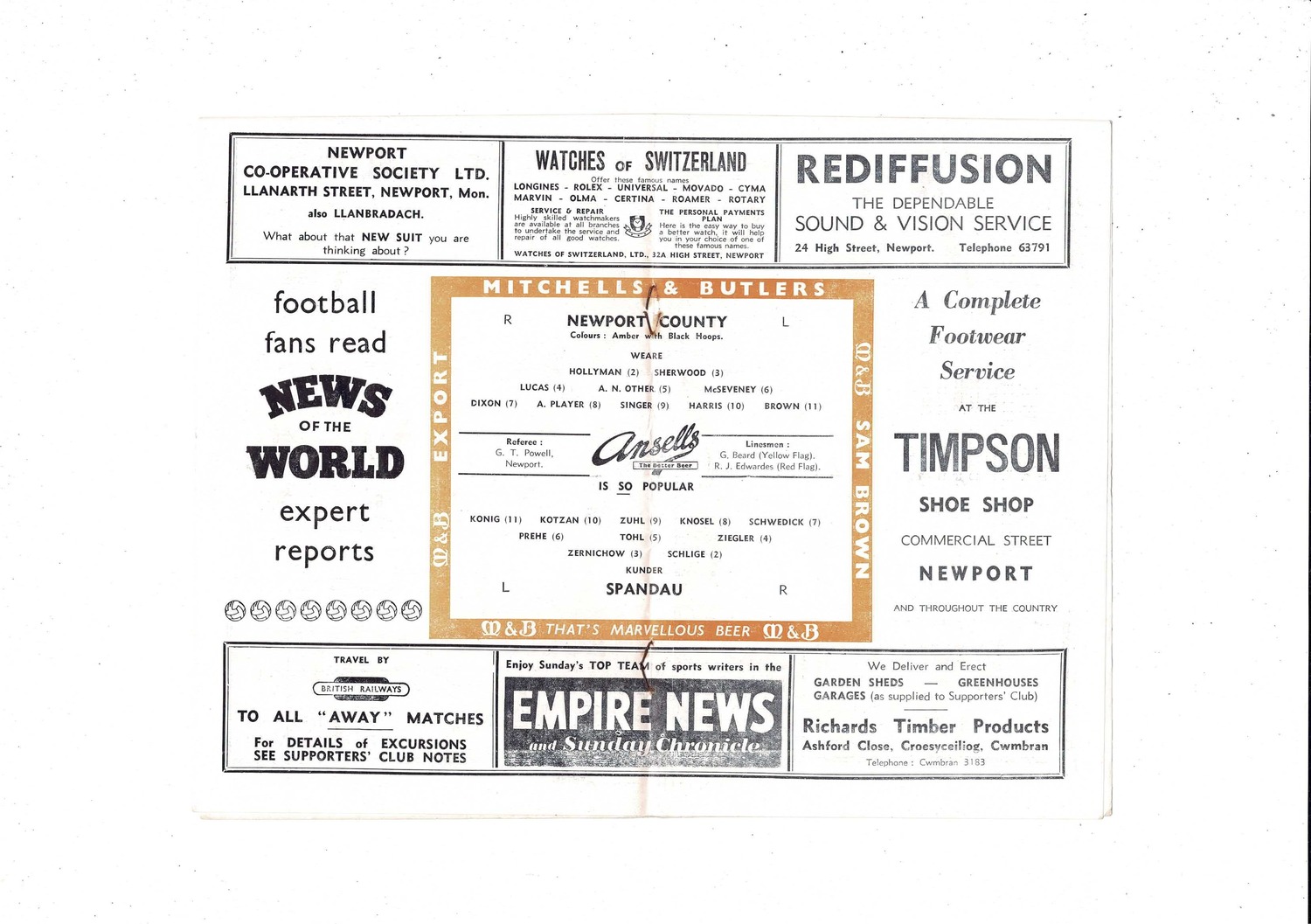 Newport v Spandau (Germany) Friendly 1957/58 Football Programme