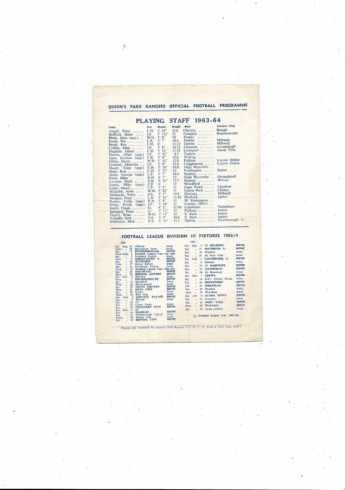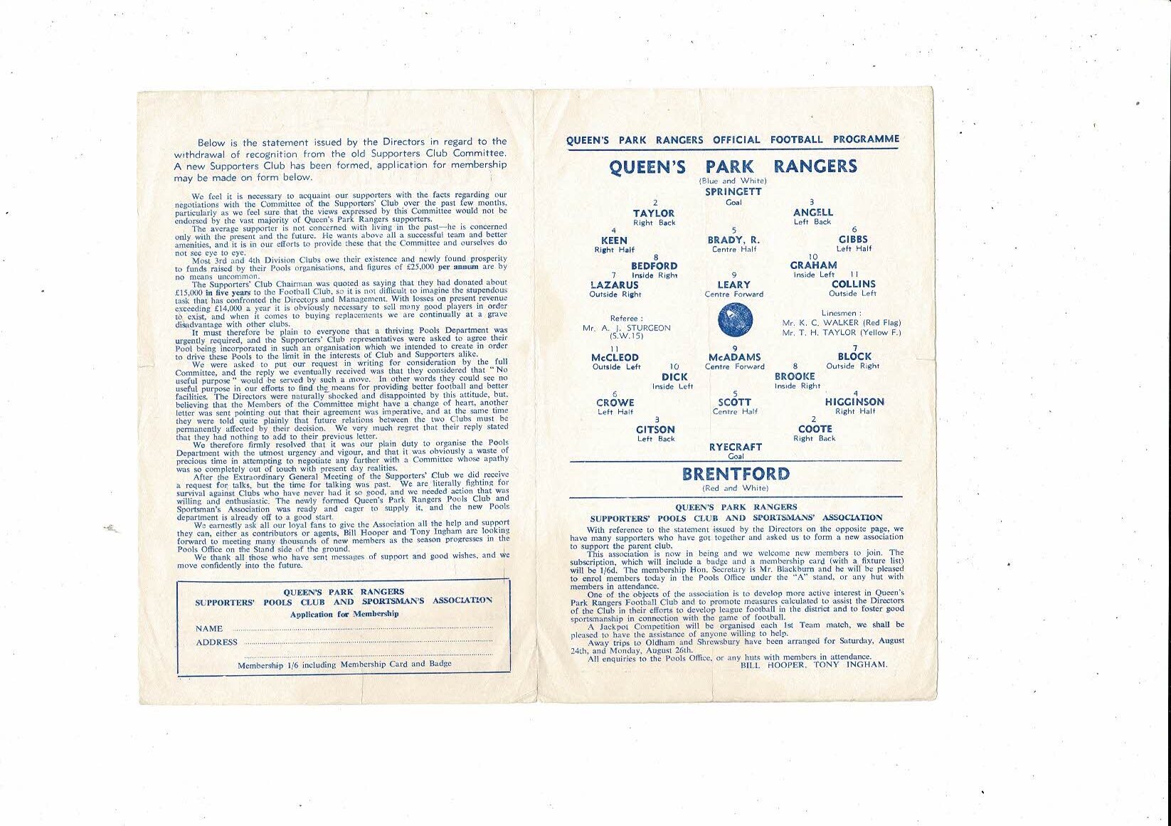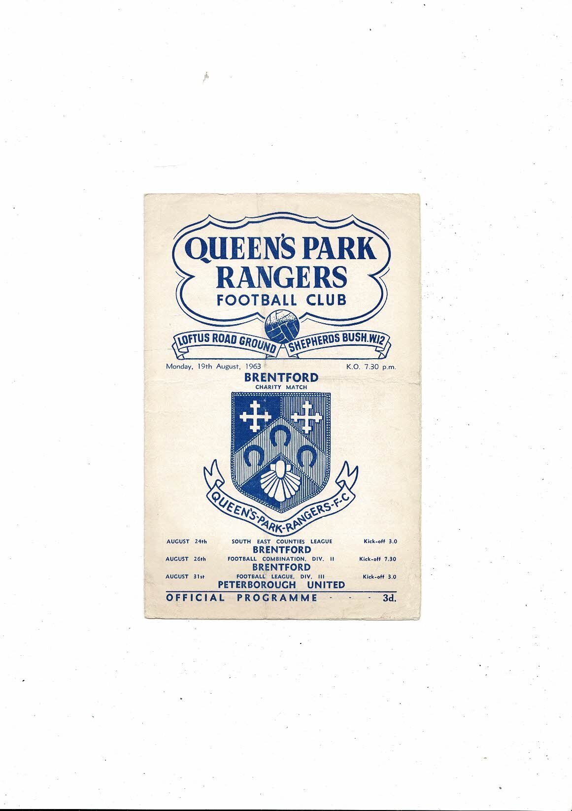 Queens Park Rangers v Brentford Charity Match Football Programme 1963/64