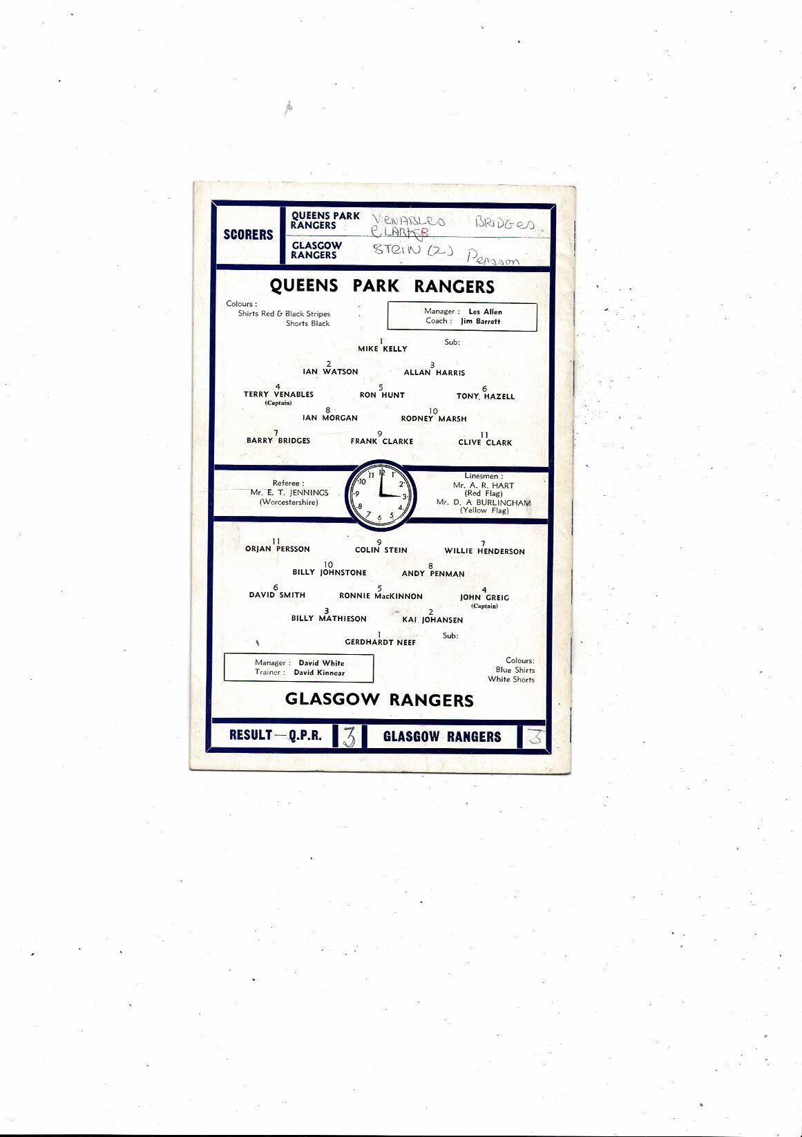 Queens Park Rangers v Rangers Friendly Football Programme. 1969/70 Autographed
