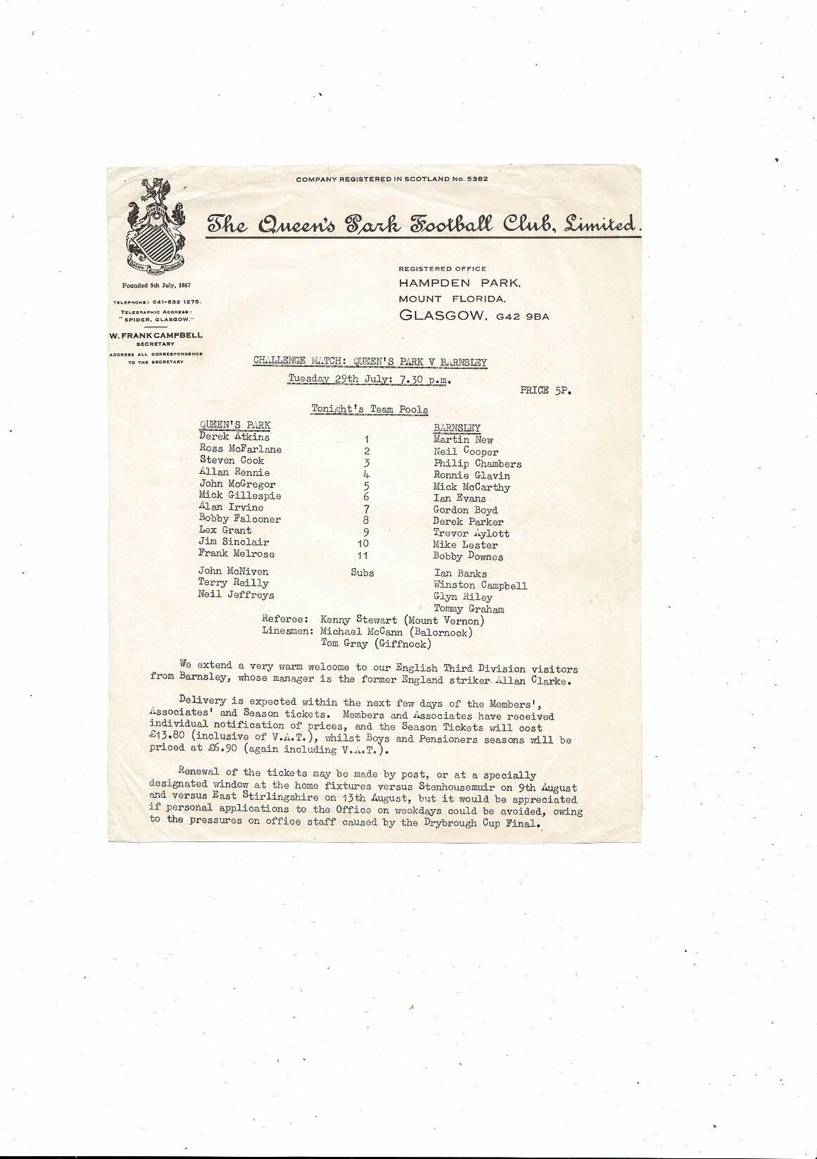 Queens Park v Barnsley Friendly Football Programme 1980/81